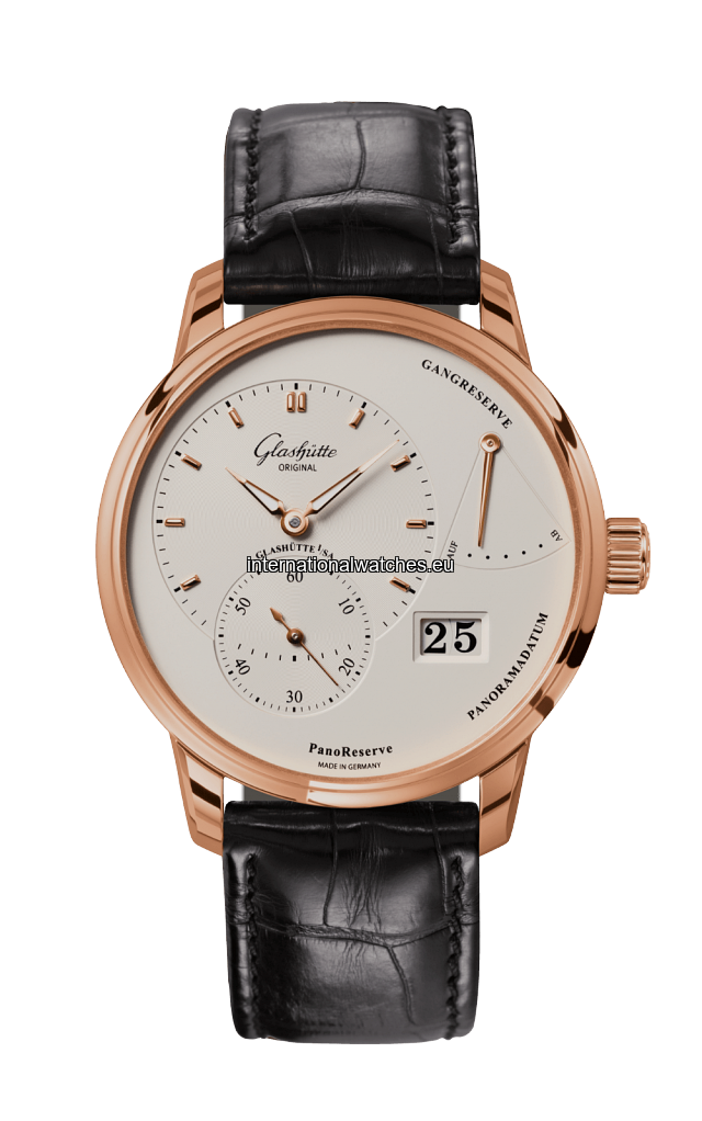 Asymmetry and harmony: The PanoReserve. A red gold watch with silver dial, Panorama Date, power reserve display, small second, black leather strap.