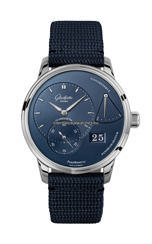 With an impressive, unmistakale design: The PanoReserve. Stainless steel watch, blue dial, Panorama Date, power reserve display, blue synthetic strap.
