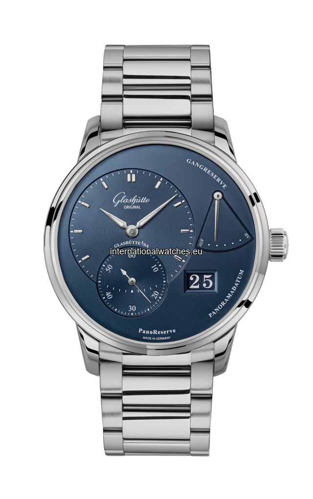 With an impressive, unmistakale design: The PanoReserve. Stainless steel watch, blue dial, Panorama Date, power reserve display, metal bracelet.