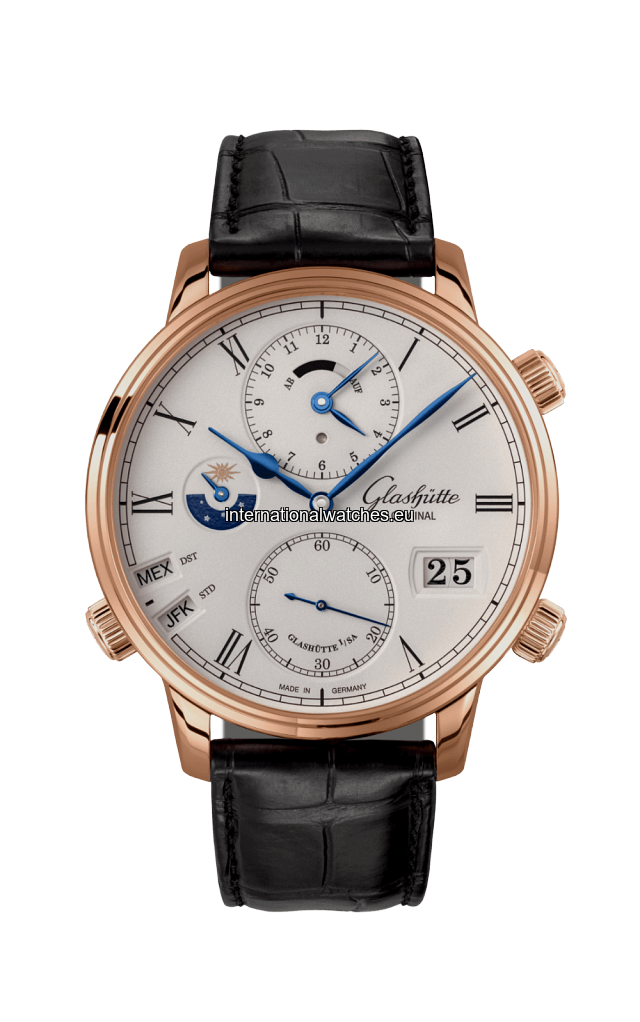 The world at a glance: The Senator Cosmopolite. Red gold watch, silver dial, second time zone, 24 time zones (GMT), Panorama Date, black leather strap.