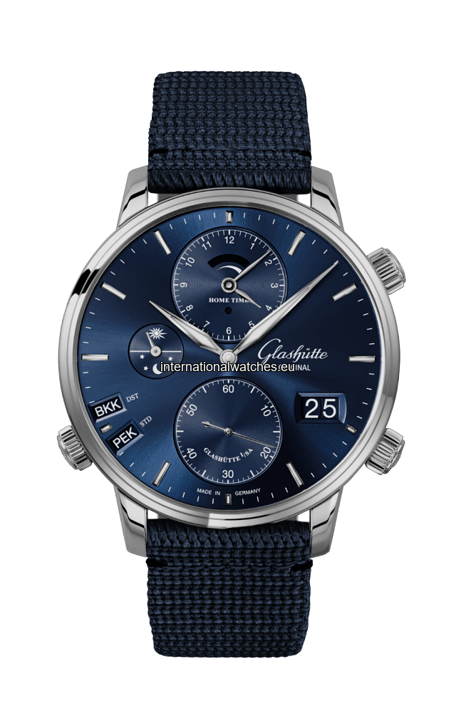 The ideal travel companion: The Senator Cosmopolite with blue dial. Stainless steel watch, second time zone, blue synthetic strap.