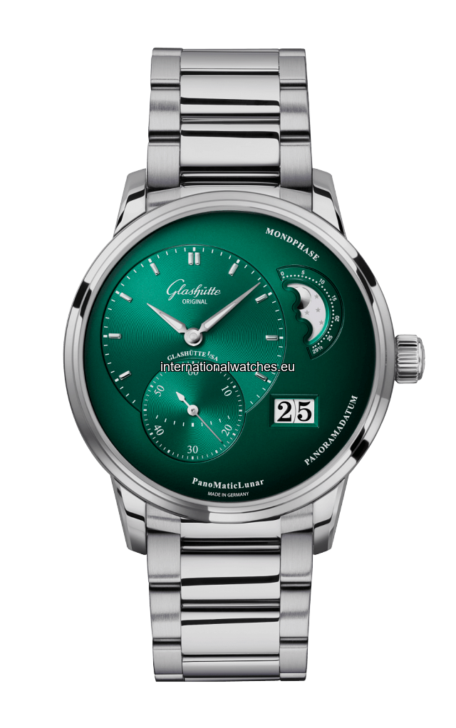 The PanoMaticLunar combines an asymmetrical design with clarity and elegance. Stainless steel, green dial, Panorama Date, moon phase, metal bracelet.