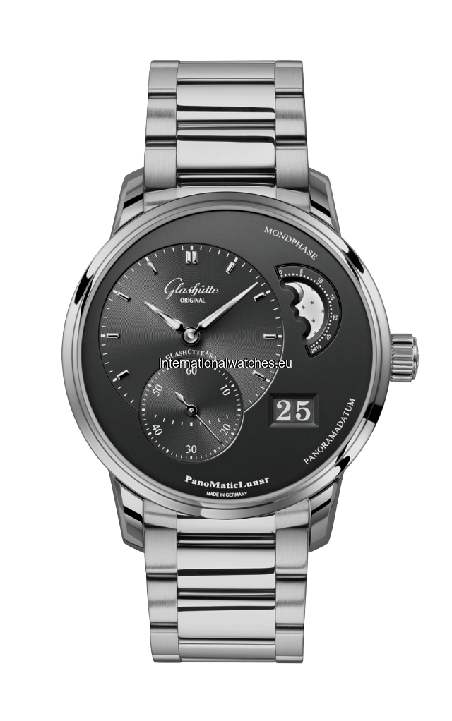 The PanoMaticLunar in stainless steel is an unusual watch with an asymmetrical design. Grey dial, Panorama Date, moon phase, metal bracelet.