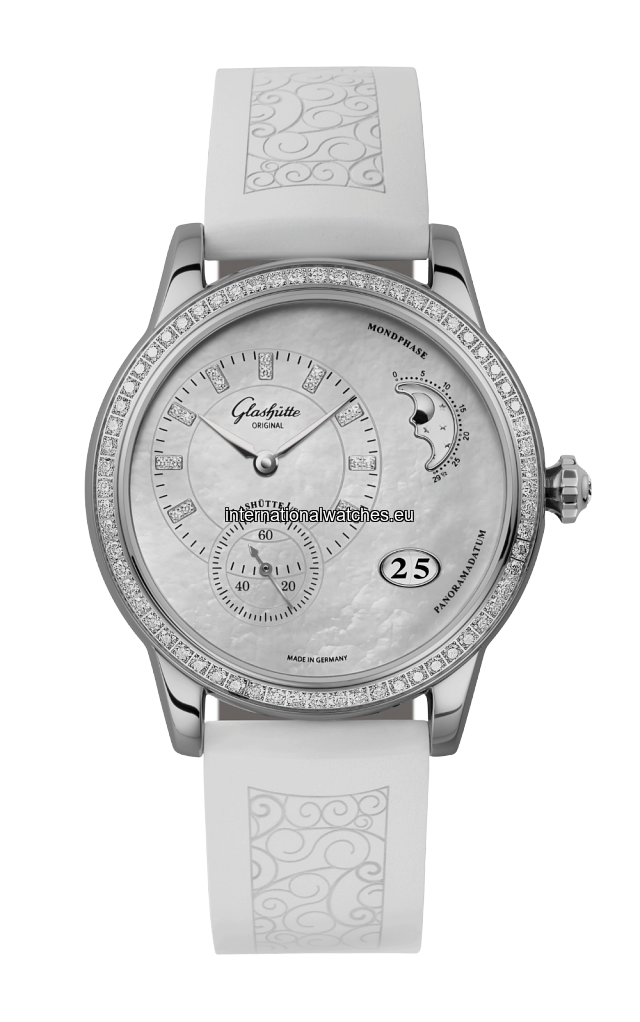 A sparkling, asymmetrical womens’ watch: the PanoMatic Luna with moon phase. Stainless steel, diamond bezel, mother-of-pearl dial, rubber strap.