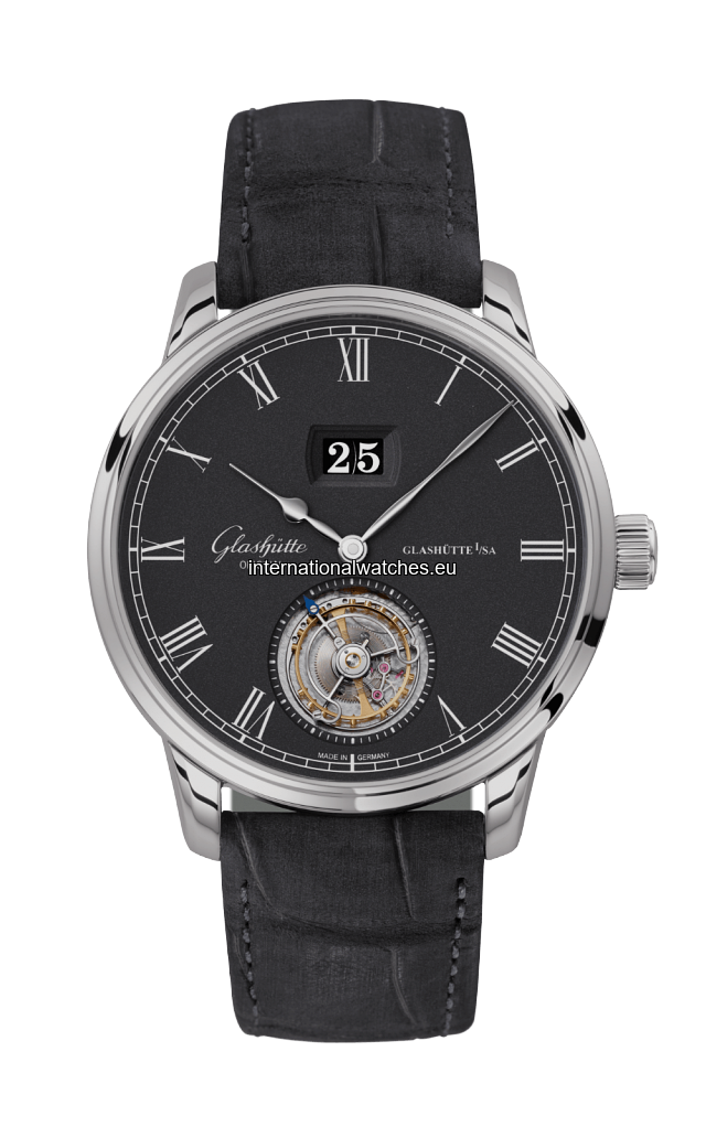 A stylish classic timepiece with a grand complication: the Senator Tourbillon. White gold watch, grey dial, Panorama Date, grey leather strap.