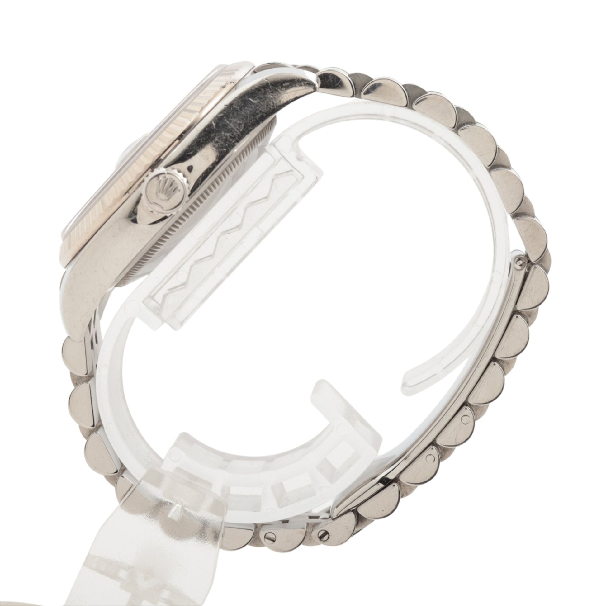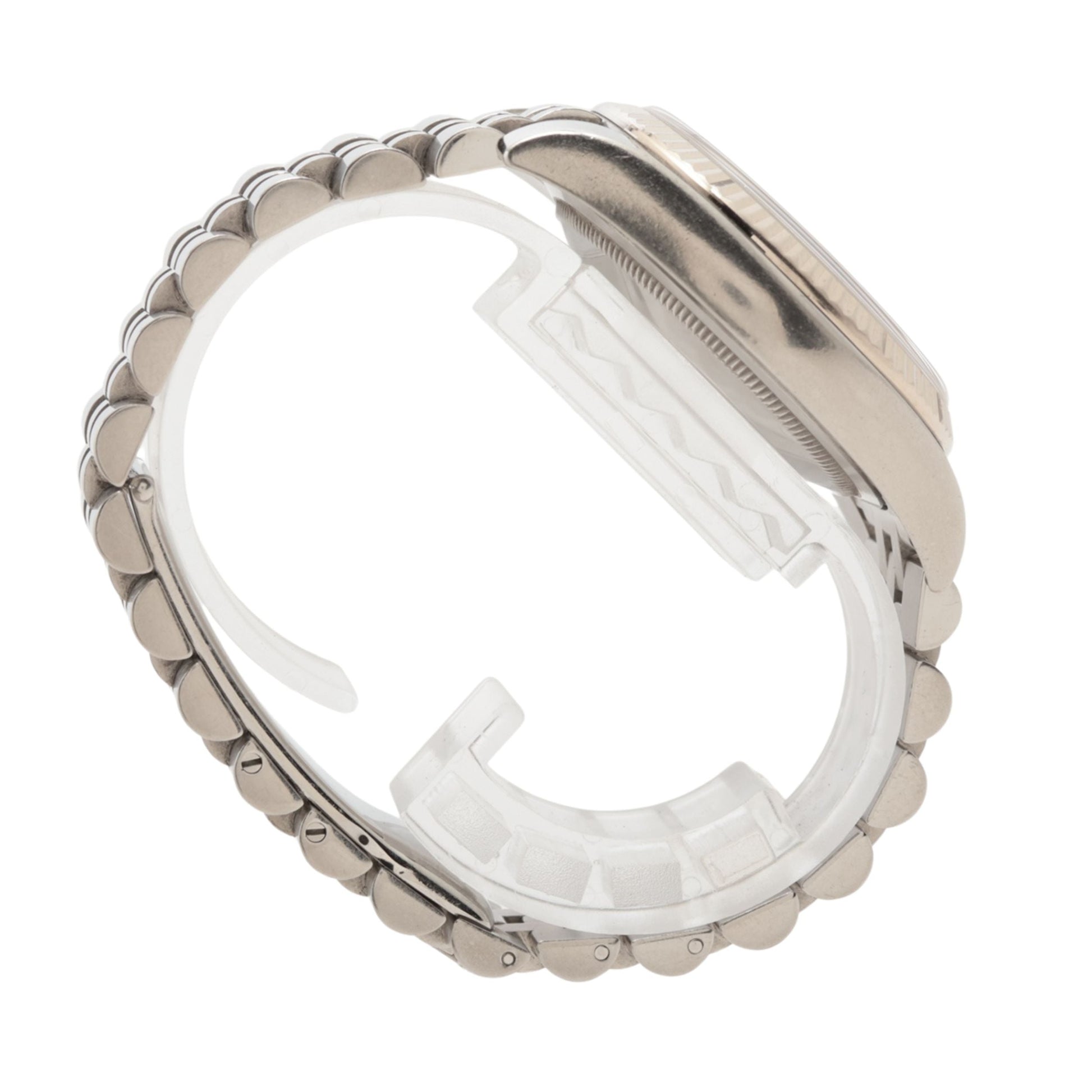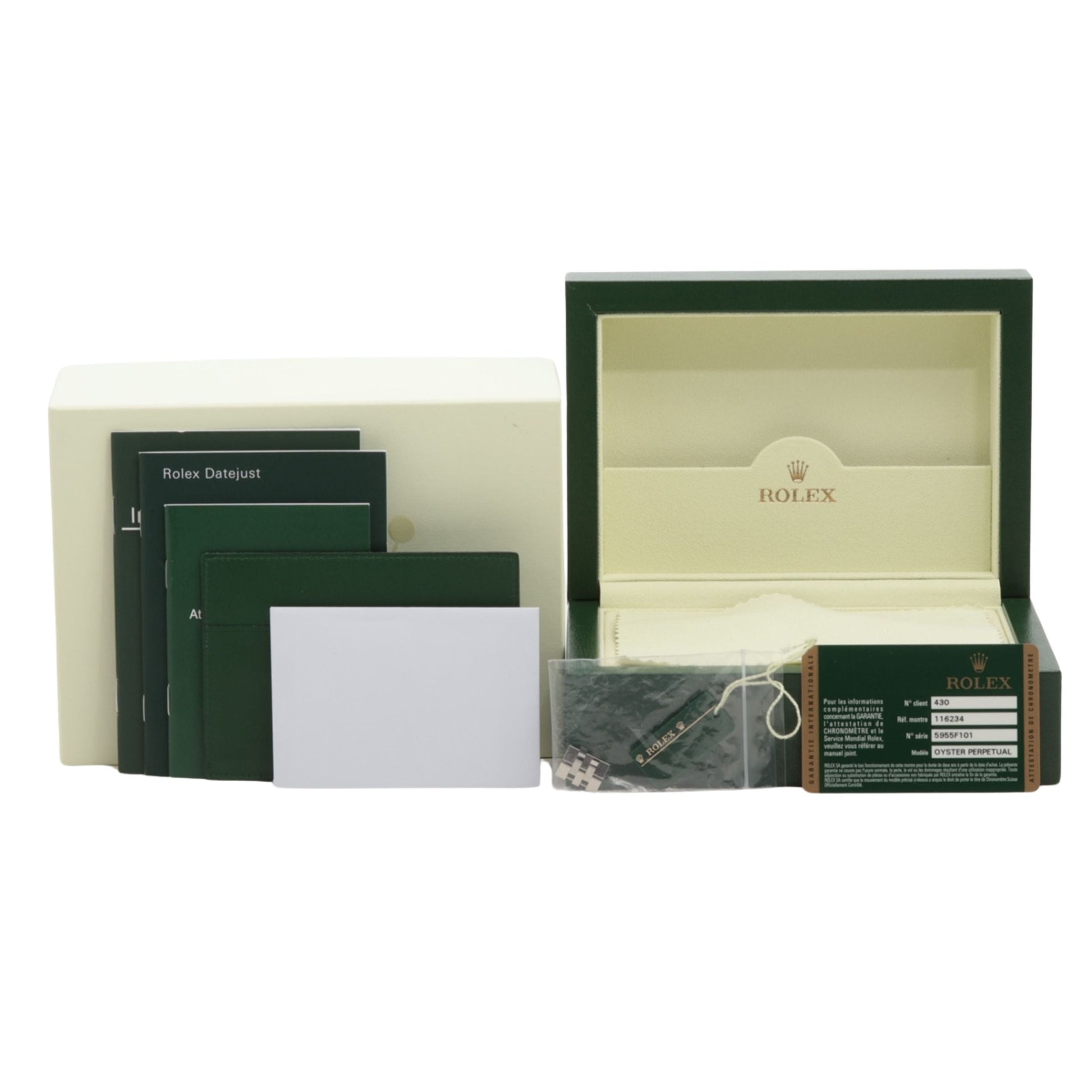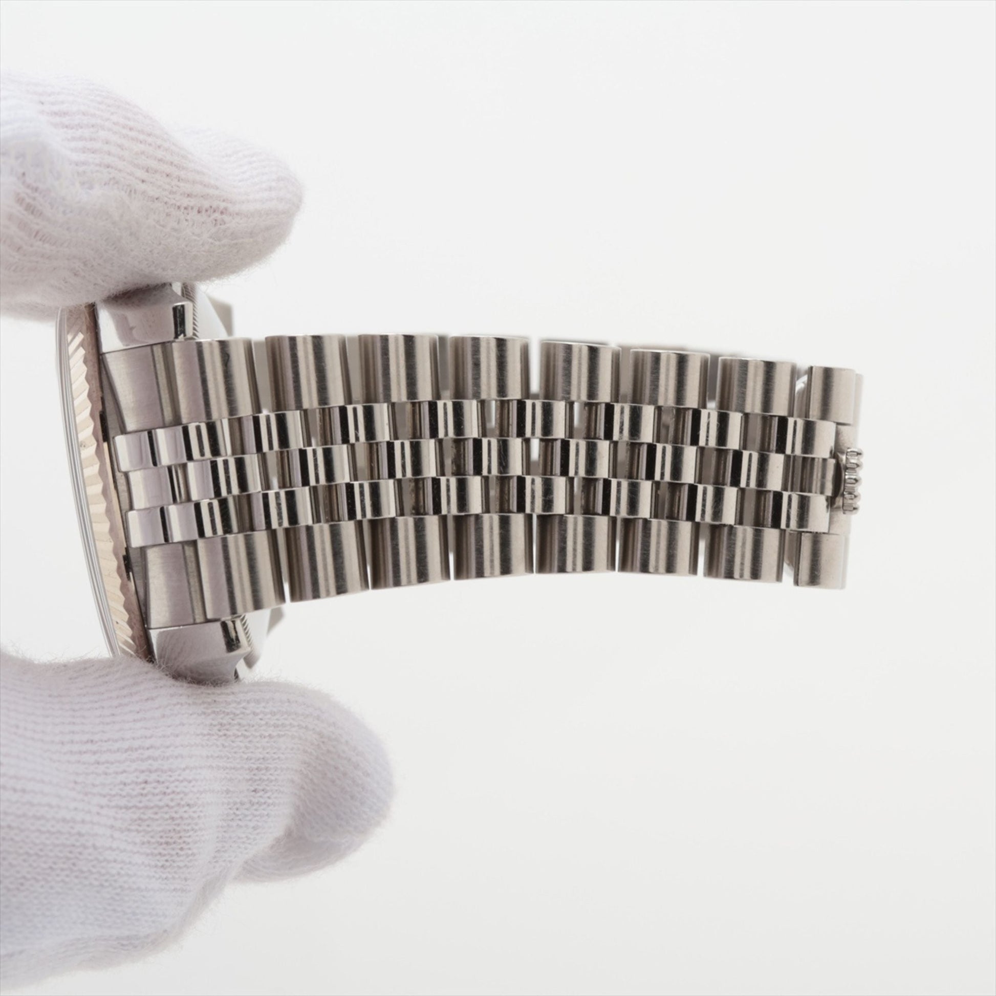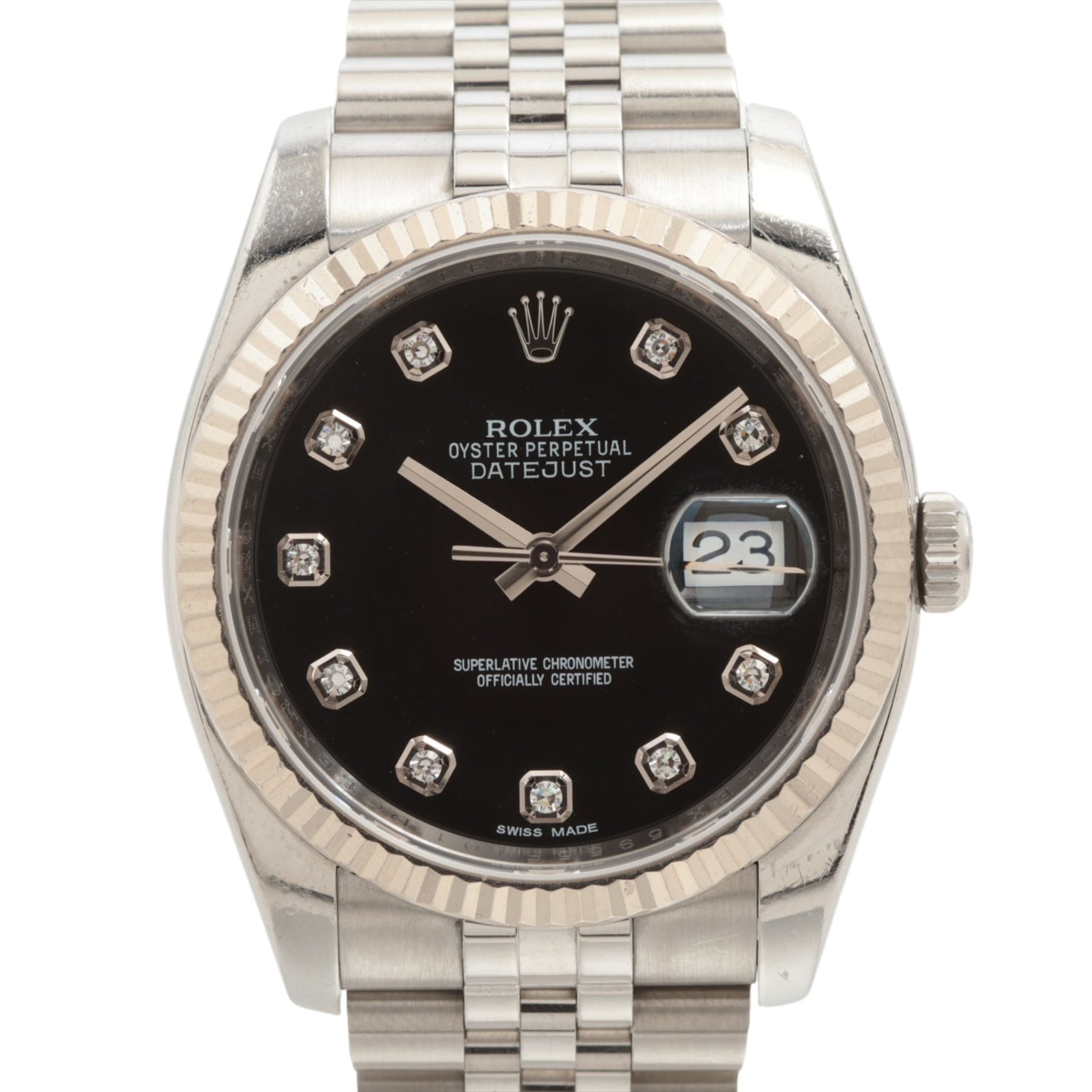 This Datejust has a stainless steel case with a stainless steel Rolex Jubilee bracelet. Black dial Index and diamonds hour markers. Scratch resistant sapphire crystal. Luminescent hands. Date display at the 3 o'clock position. Rolex Calibre 3135 Automatic movement has a 50h power reserve.
