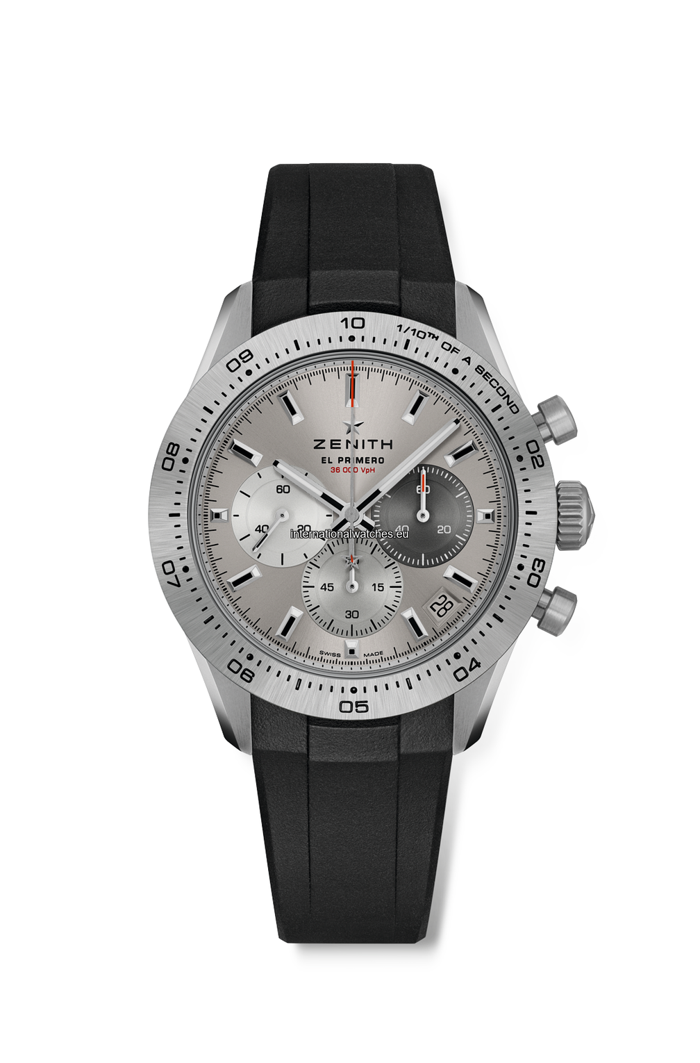 The CHRONOMASTER Sport is crafted in a 41mm titanium case with a brushed titanium bezel, paired with a nickel-grey sunburst tricolour dial and a black rubber strap. Powered by the El Primero 3600 automatic high-frequency chronograph movement with 1/10th of a second chronograph function and a power reserve of 60 hours.