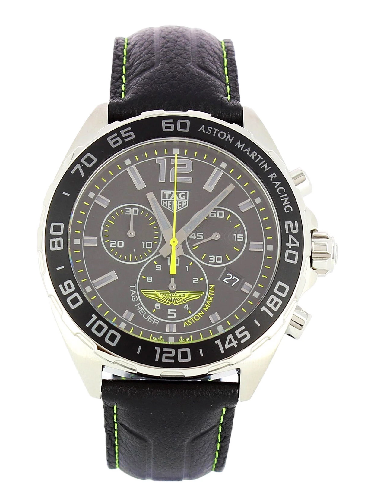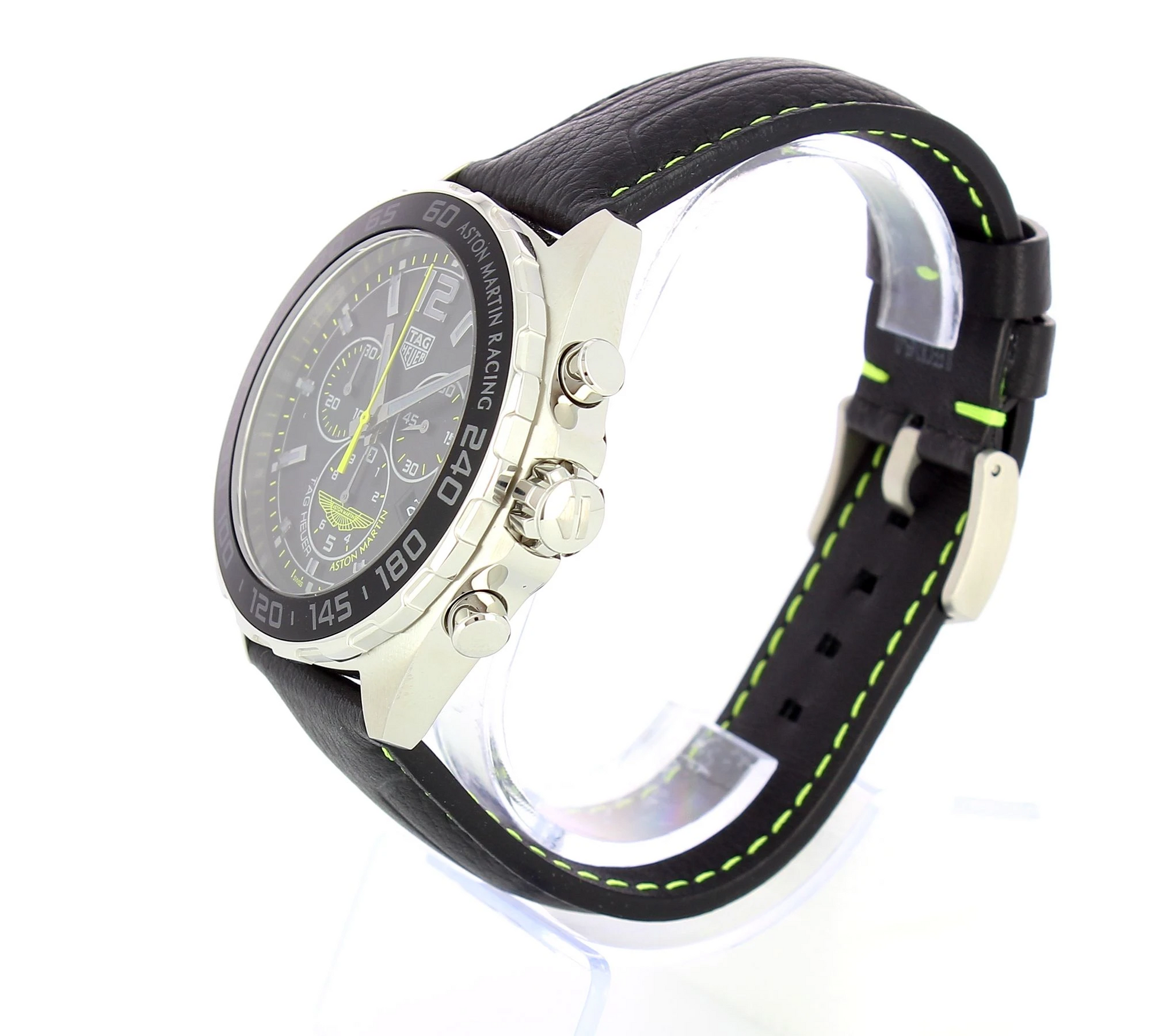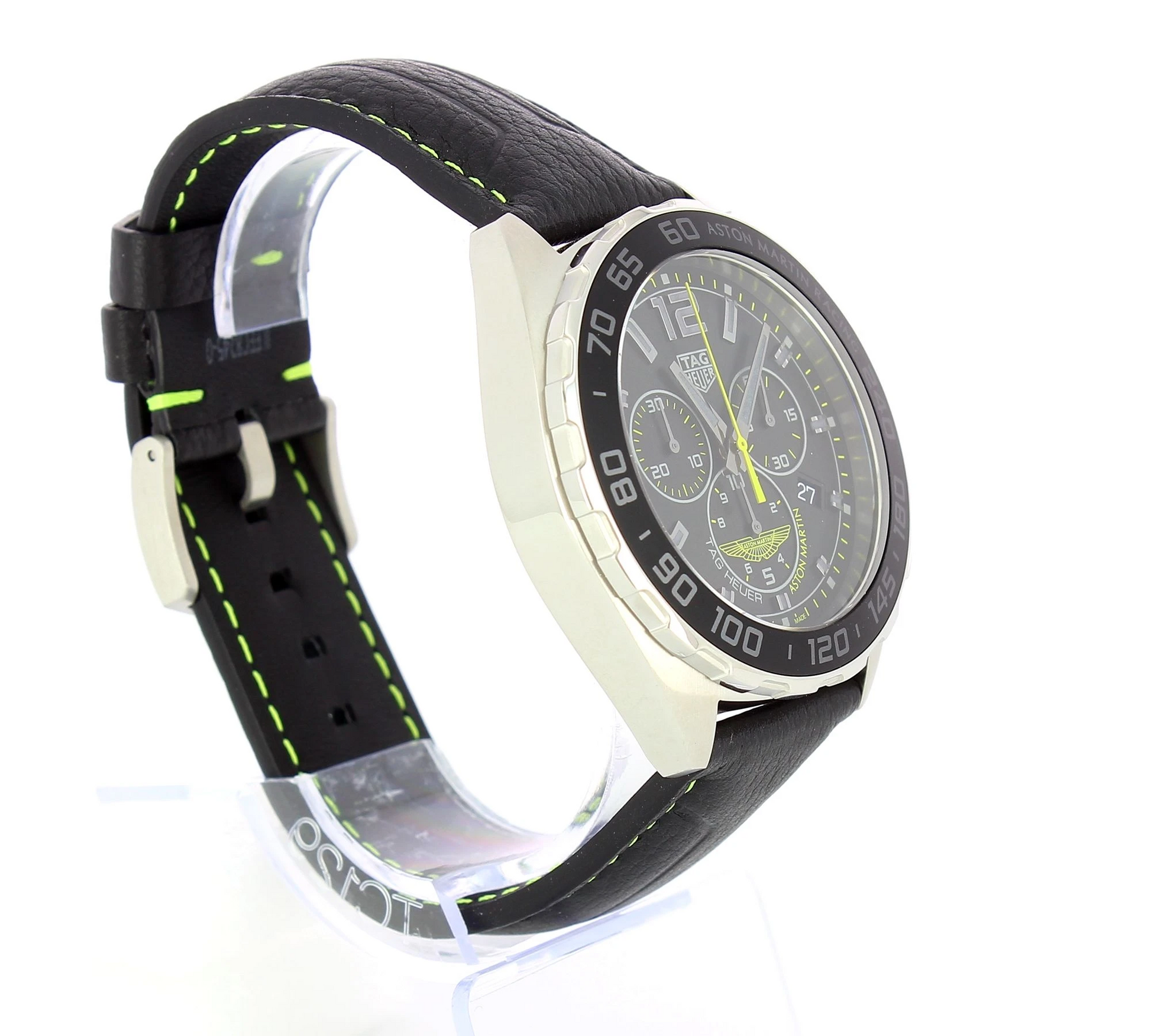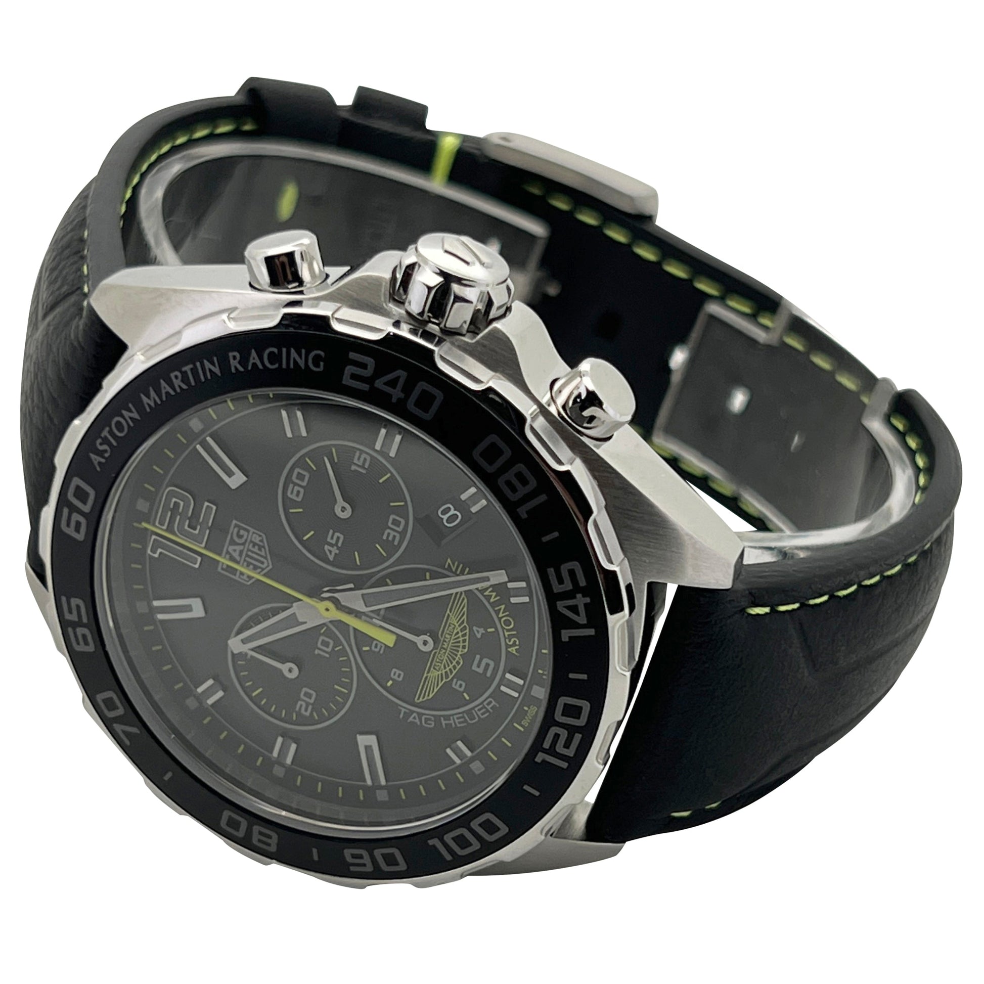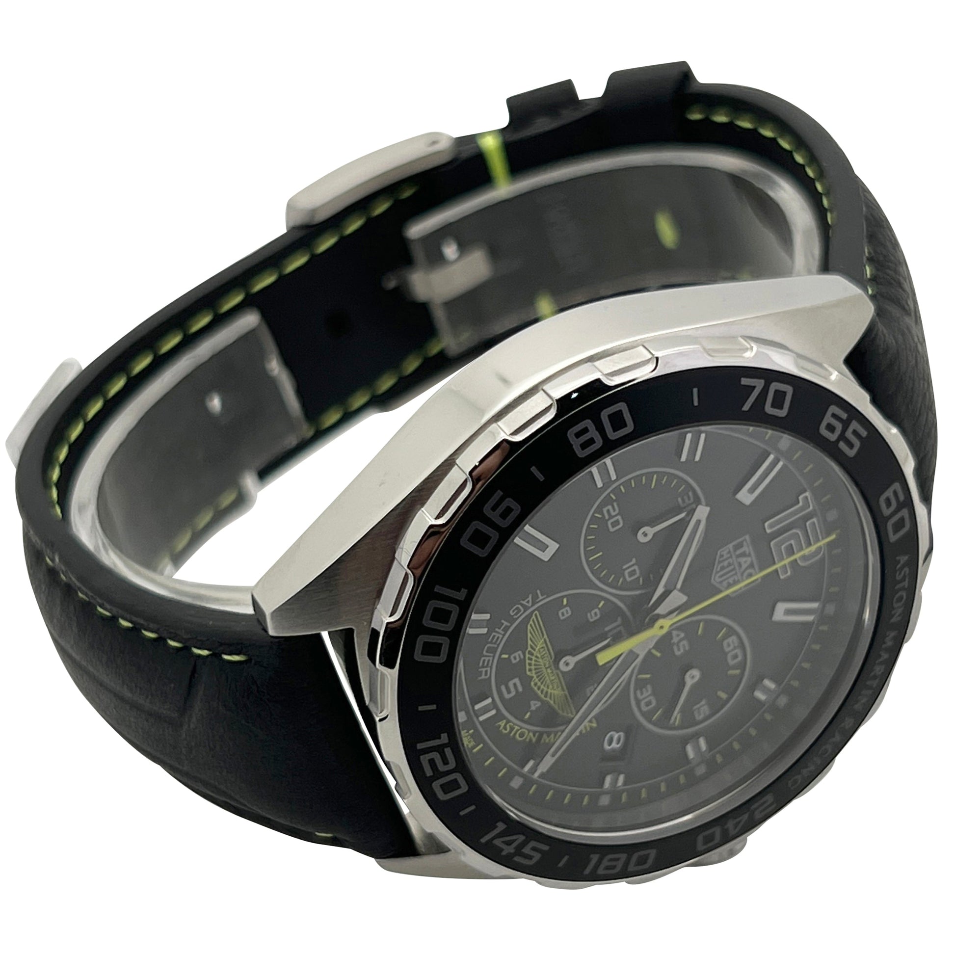 This Formula 1 is a special edition Aston Martin. This watch has a stainless steel case with a black leather strap. Fixed bezel with tachymeter scale. Aston Martin decoration on the case back. Black dial with luminescent index hour marker. Chronograph with three sub-dials. Date at the 4 o'clock position. Tag Heuer quartz movement.