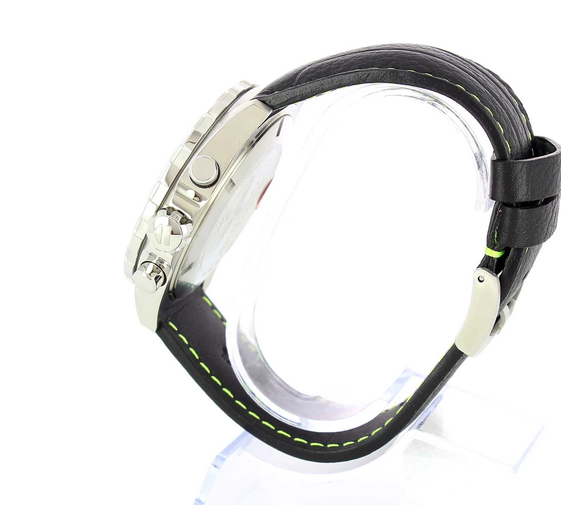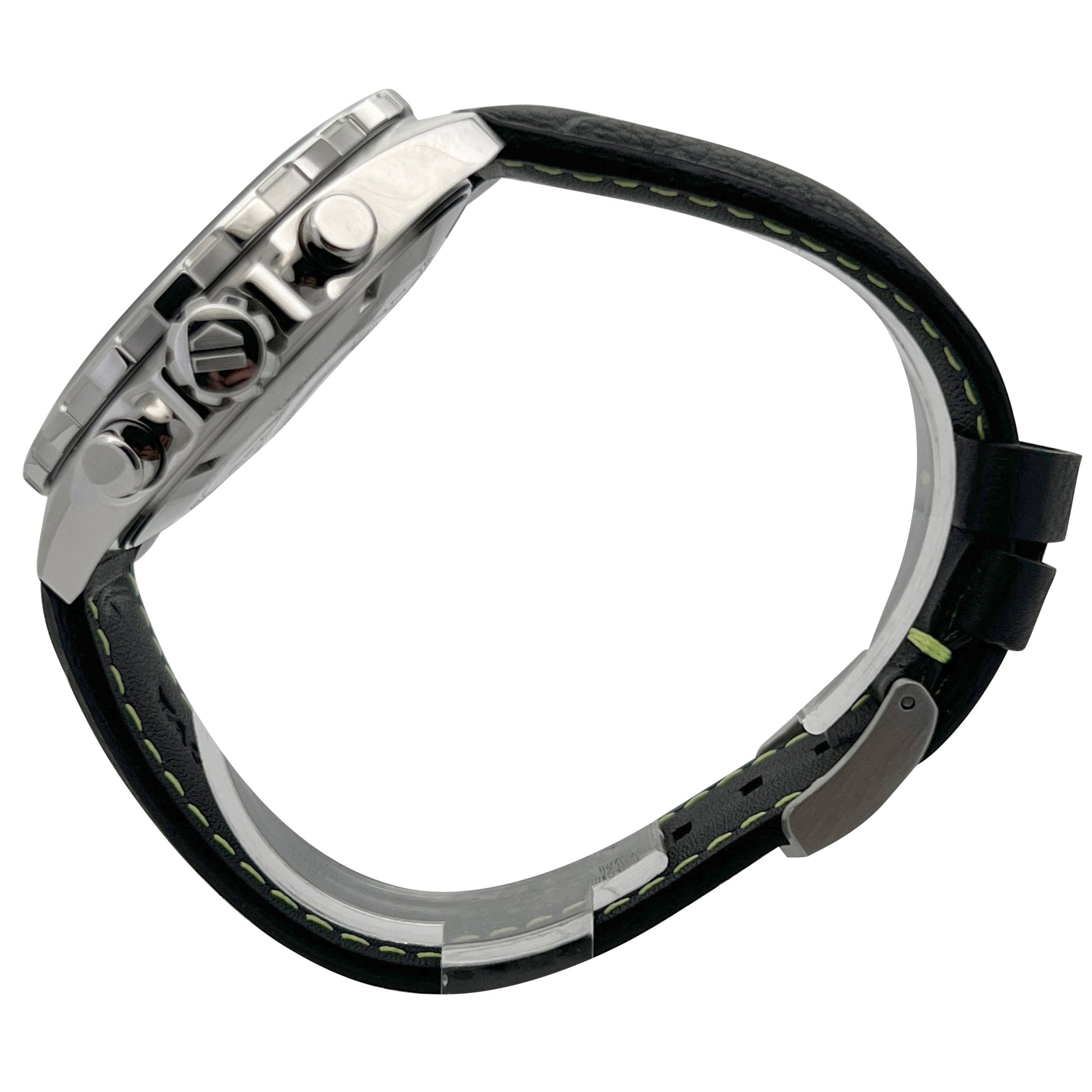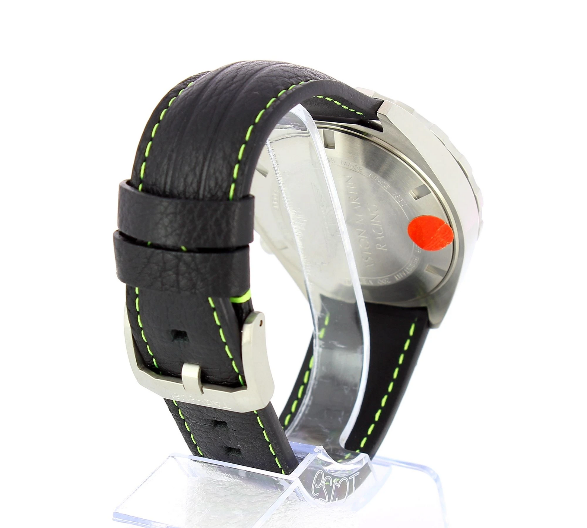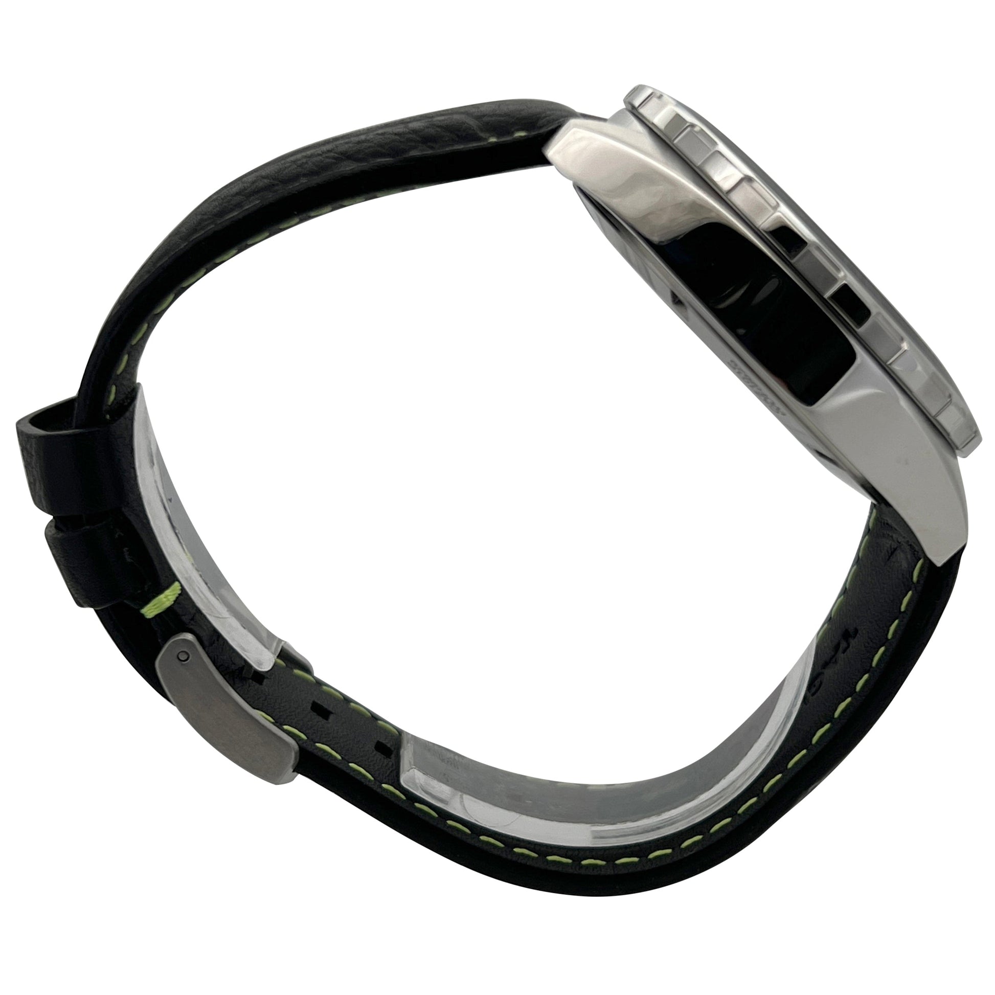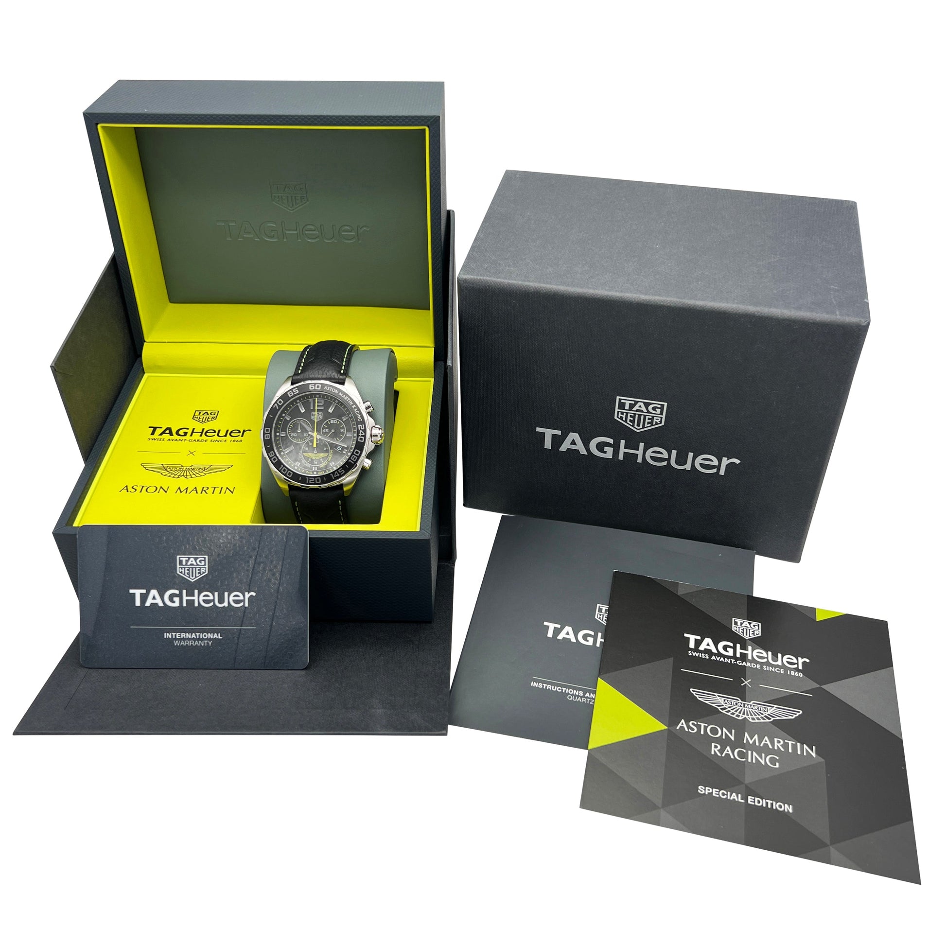 This Formula 1 is a special edition Aston Martin. This watch has a stainless steel case with a black leather strap. Fixed bezel with tachymeter scale. Aston Martin decoration on the case back. Black dial with luminescent index hour marker. Chronograph with three sub-dials. Date at the 4 o'clock position. Tag Heuer quartz movement.