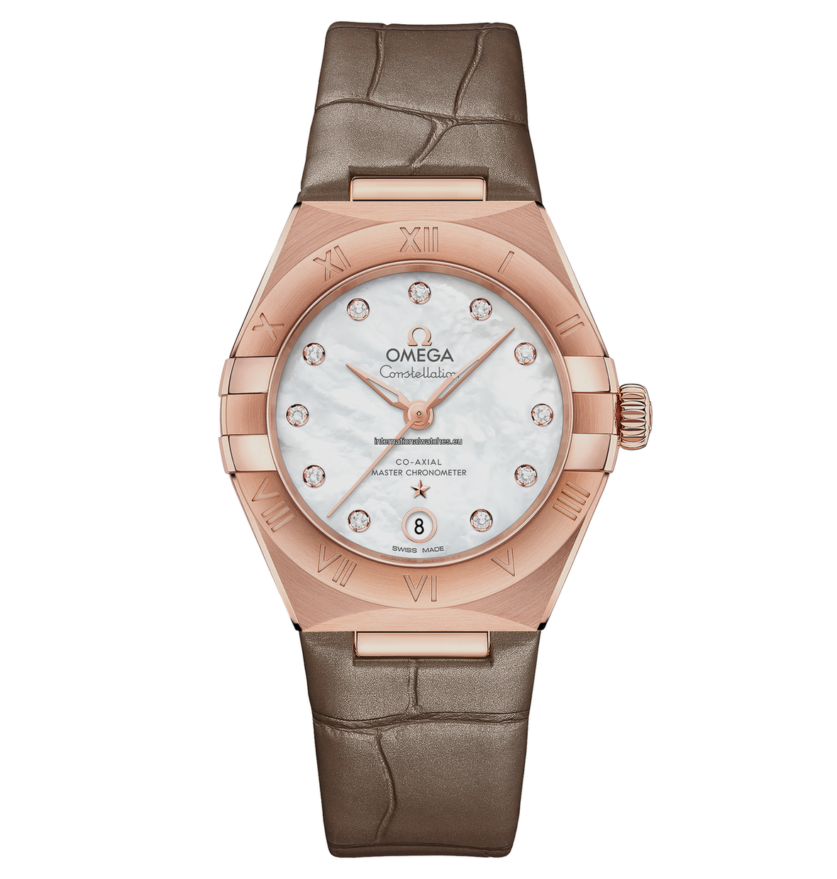 This 29 mm 18K Sedna™ gold model features a bezel with engraved Roman numerals, pearled mother-of-pearl dial with diamond hour markers and a date window at the 6 o'clock position. The hands, OMEGA logo, Constellation star and diamond holders are also in 18K Sedna™ gold.
