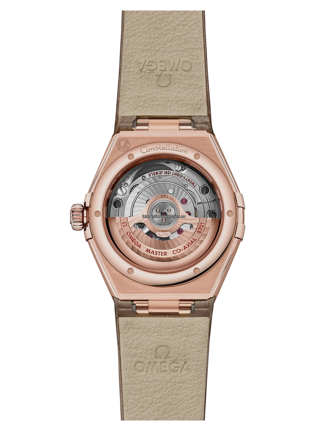 At the heart of this timepiece is the OMEGA Co-Axial Master Chronometer Calibre 8701, visible through the domed scratch-resistant sapphire crystal.