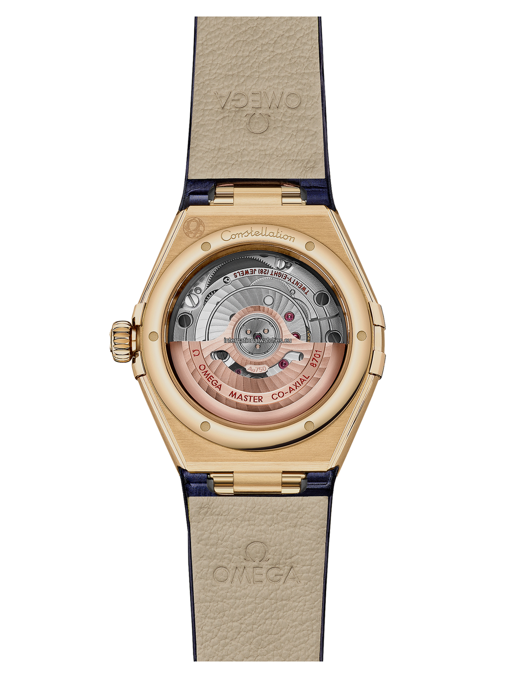 At the heart of this timepiece is the OMEGA Co-Axial Master Chronometer Calibre 8701, visible through the domed scratch-resistant sapphire crystal.