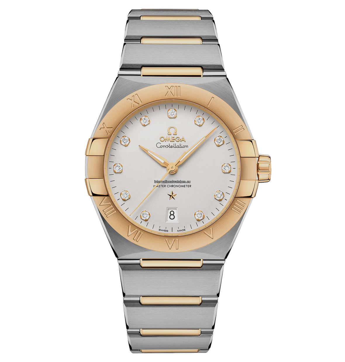This 39 mm stainless steel and 18K yellow gold model features a bezel engraved with Roman numerals, an opaline silvery dial with diamond hour-markers and a date window at the 6 o'clock position. The hands, OMEGA logo, Constellation star and diamond-holders on the dial are all in 18K yellow gold.