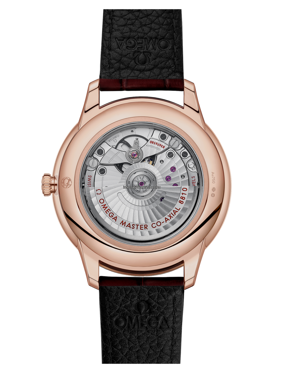 This Master Chronometer certified watch is presented on a burgundy leather strap and is driven by the OMEGA Master Co-Axial Calibre 8810, which can be admired through the scratch-resistant sapphire crystal caseback.