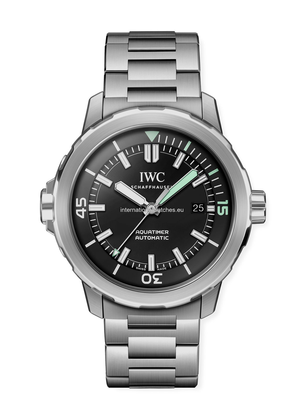 A robust construction, high pressure resistance, easy readability, and innovative technical functionality: these are the key features of the Aquatimer dive watches IWC has been engineering since 1967 and that are used by both professional and recreational scuba divers. The Aquatimer Automatic is a dive watch water-resistant to 30 bar in a 42-millimeter case made of corrosion-resistant stainless steel. The diving-relevant indications on the black dial are coated with green luminous material to ensure optimum legibility under water. At work inside the case is the IWC-manufactured 32111 caliber, which features automatic winding and a power reserve of 120 hours. The innovative external/internal rotating bezel combines ease of use with safety. The rotation of the external bezel is transmitted via a sliding clutch system to the internal bezel. The SafeDive system ensures that the inner ring with the dive time scale always rotates counterclockwise. Therefore, even in the event of an unintentional adjustment, the dive time can never be extended, and the diver's safety is guaranteed at all times. Thanks to the IWC quick-change system, the stainless steel bracelet can be exchanged for another strap effortlessly.