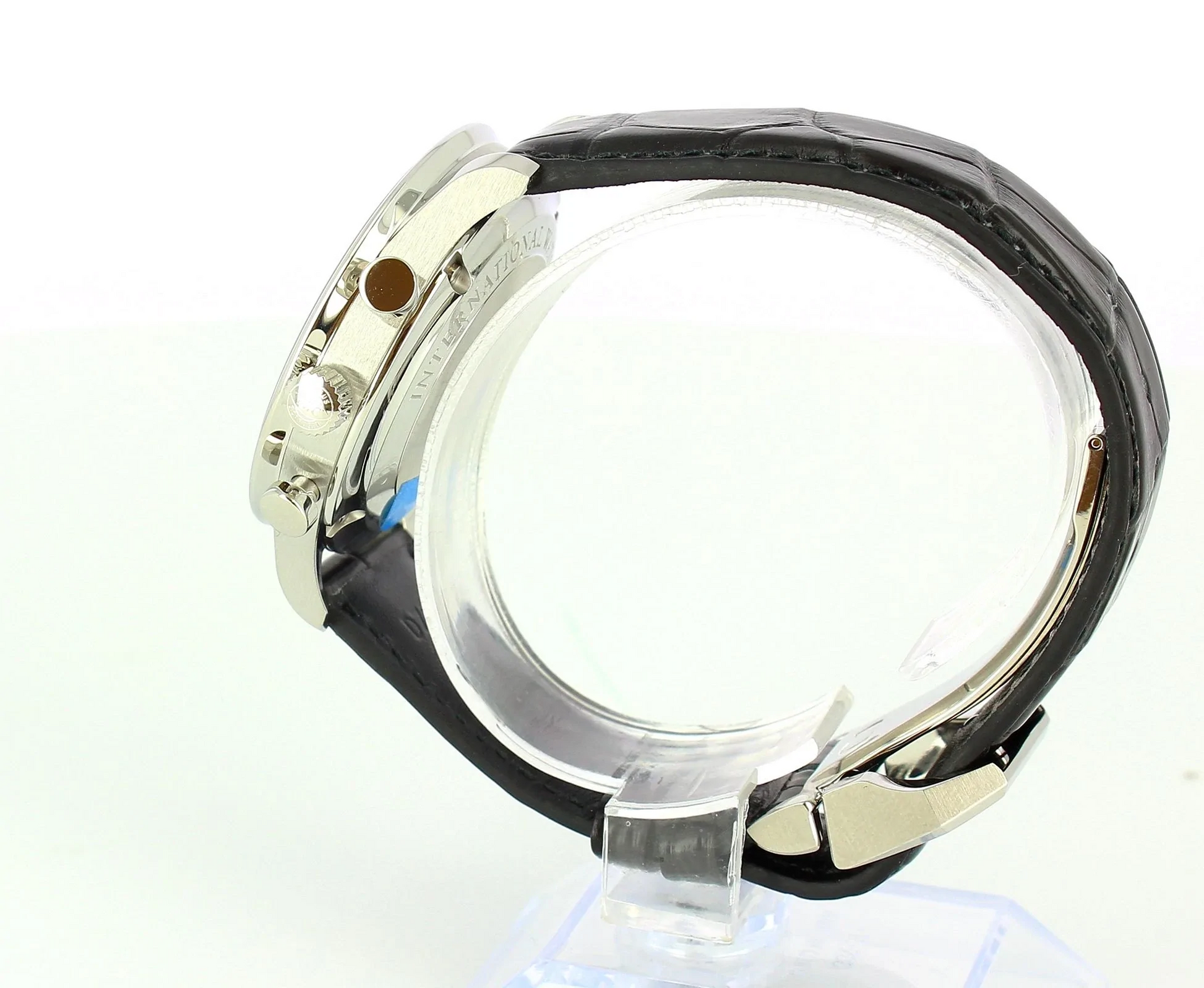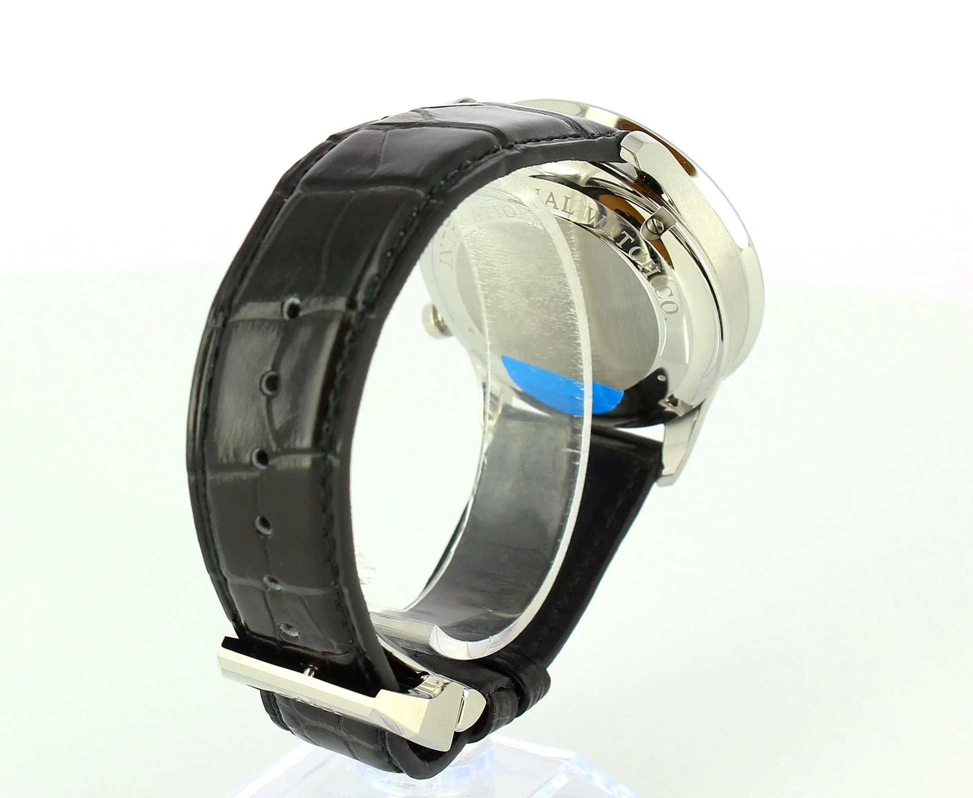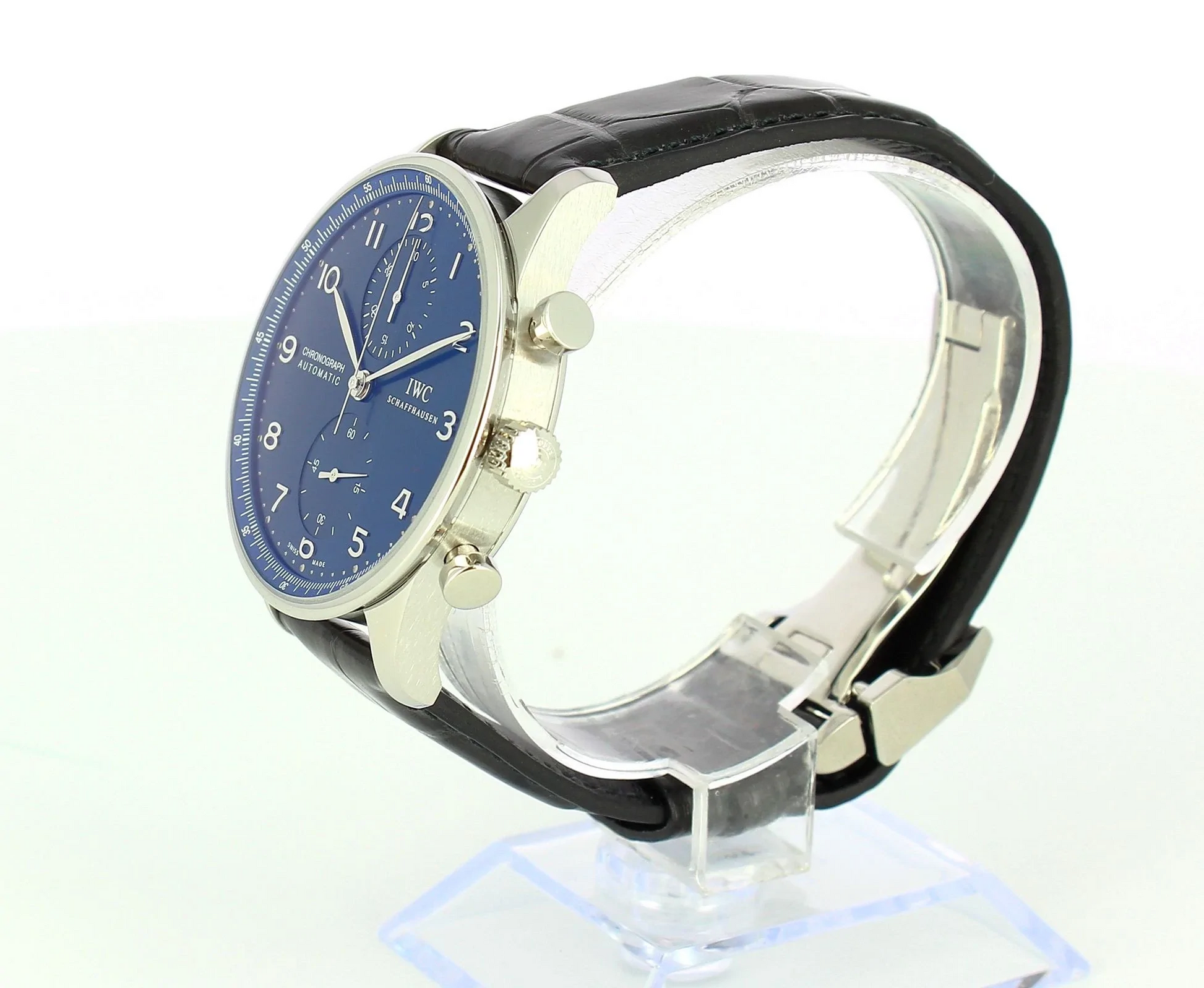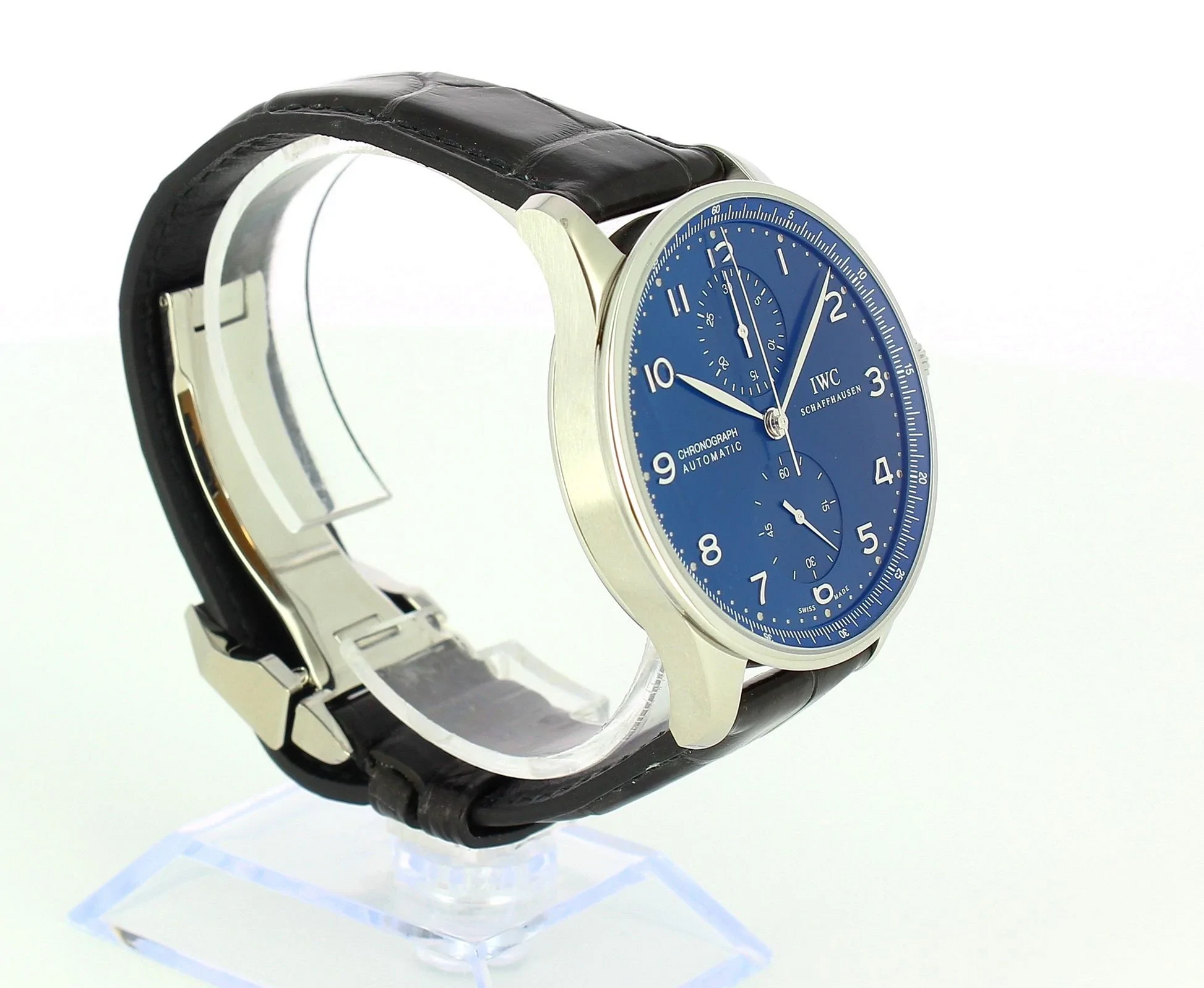 This Portugieser has a stainless steel case with a black croco strap. Fixed stainless steel bezel. Blue dial with silver-tone hands and Arabic numeral hour markers. Scratch resistant sapphire crystal. Chronograph with two sub-dials displaying: 60 second and 30 minute. IWC calibre 79350 automatic movement with a 44-hour power reserve. Ref. 371491
