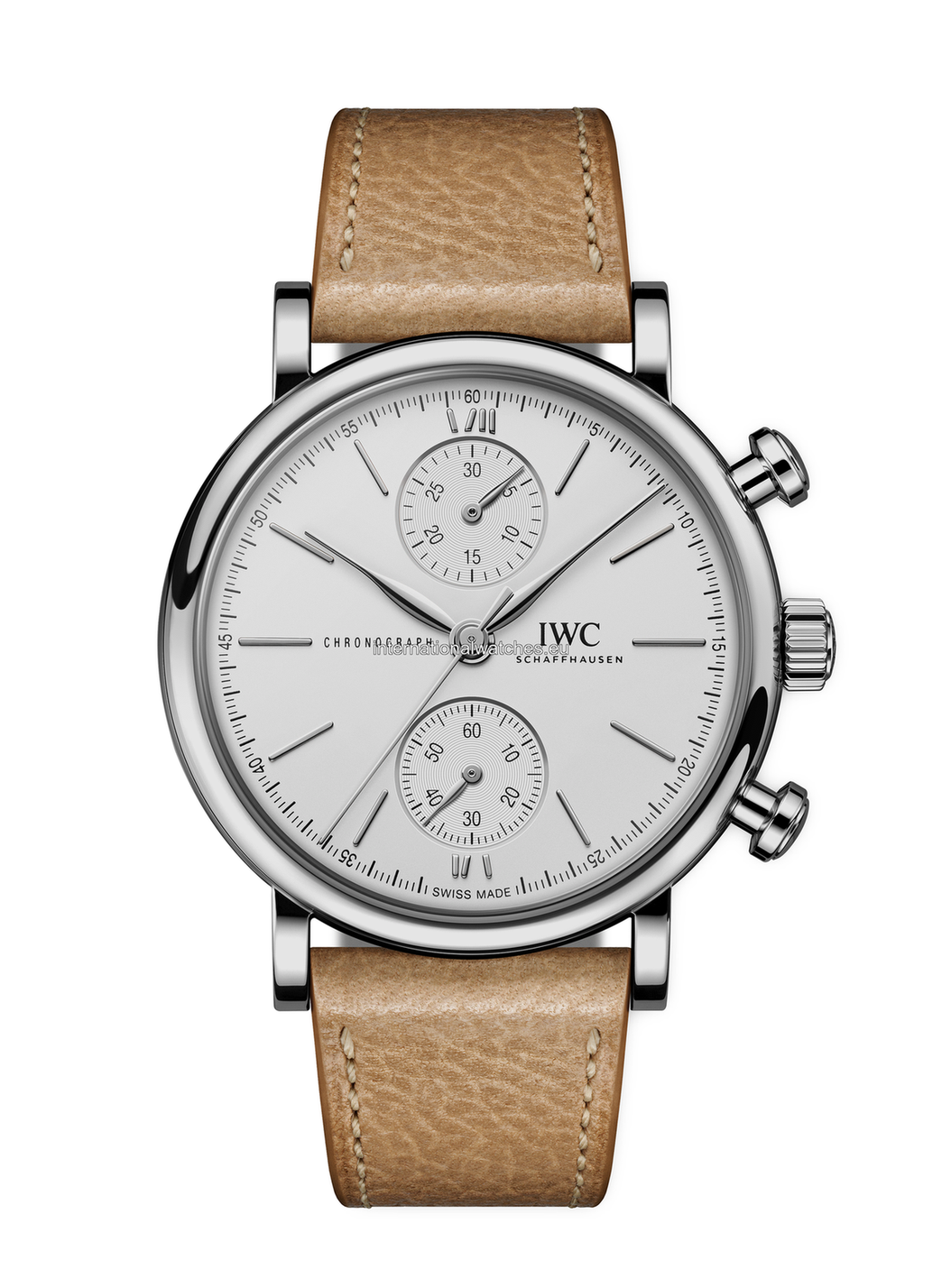 The Portofino Chronograph 39 combines classic and elegant Portofino design with a sporty chronograph complication. Its slightly reduced case diameter of 39 millimetres ensures excellent wearability even on more slender wrists. This version features a stainless steel case. The rhodium-plated hands and appliques harmonize beautifully with the silver-plated dial. At work inside the case is the IWC-manufactured 69355 calibre chronograph movement, enabling the measurement of stop times of up to 30 minutes. The chronograph in classic column-wheel design is visible through the sapphire glass case back. Sporty and elegant at once, this timepiece is fitted with a beige calfskin strap. Thanks to the integrated quick-change system, the strap can be exchanged in no time at all.