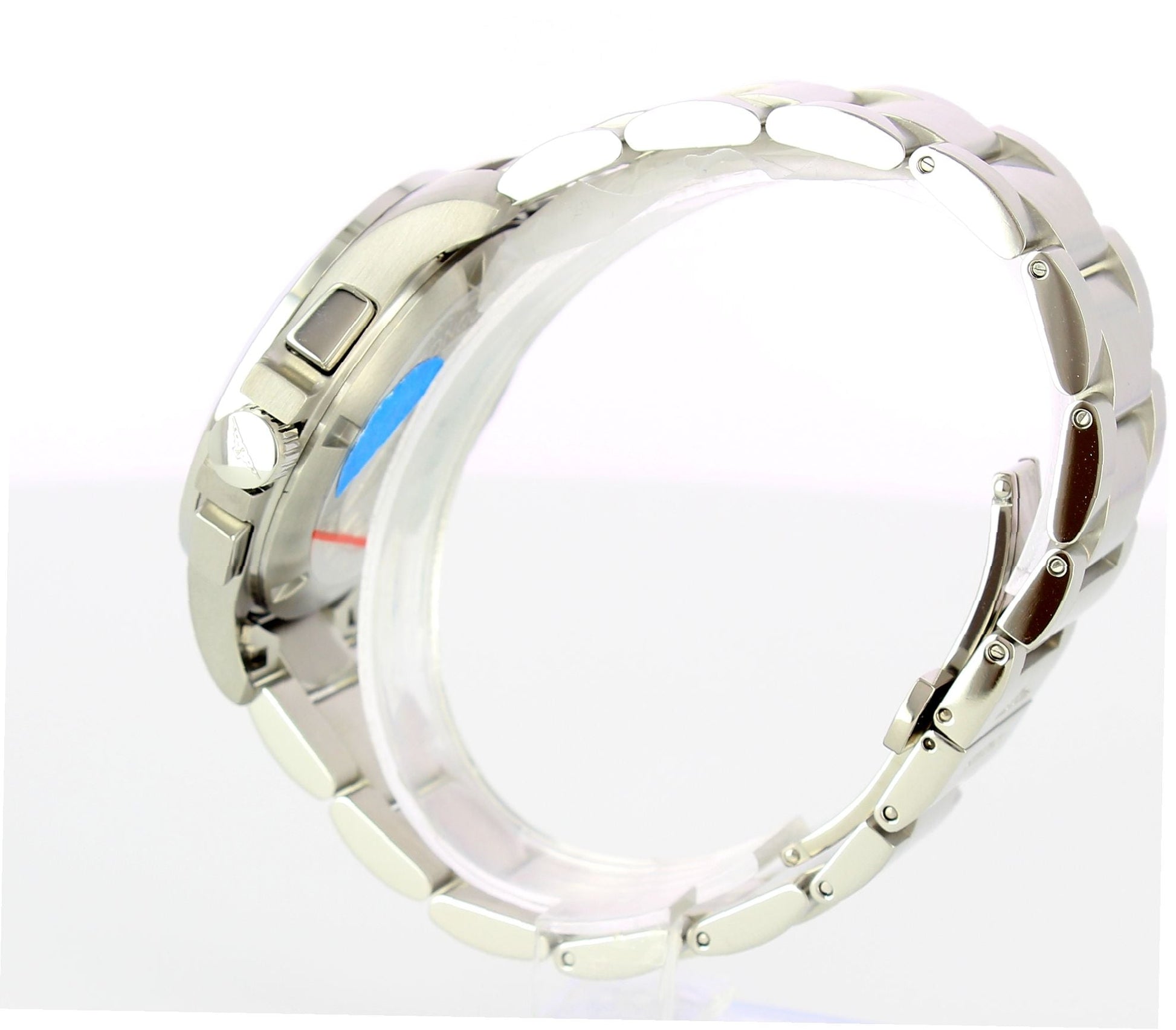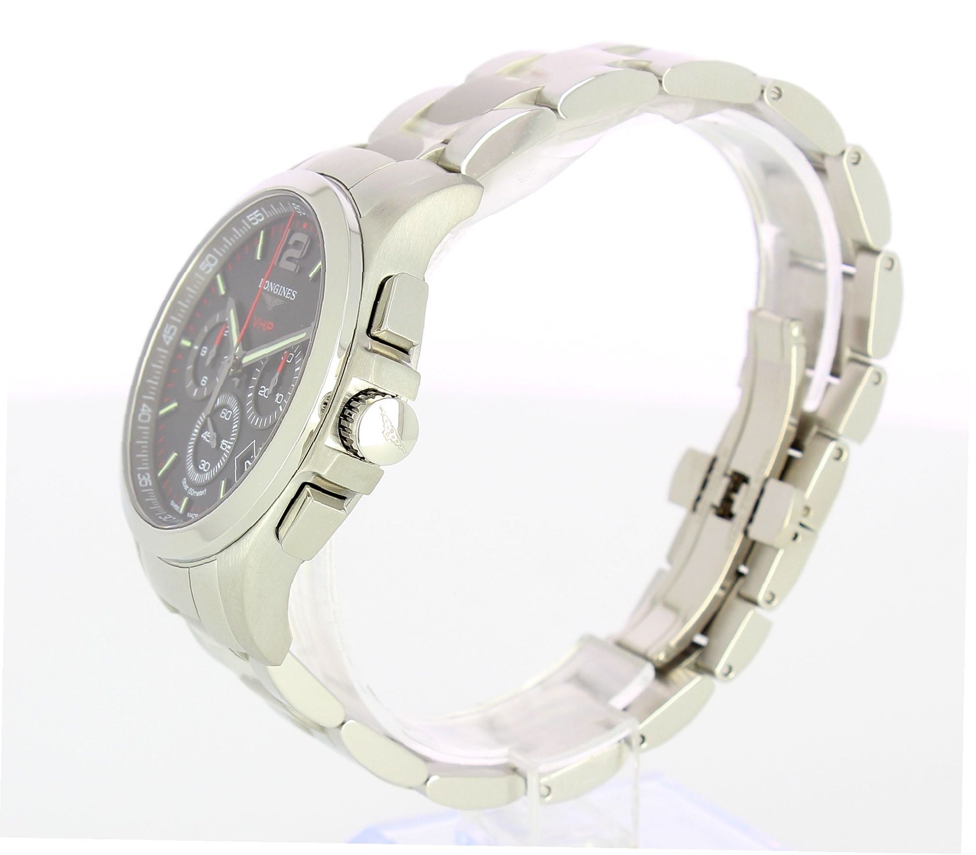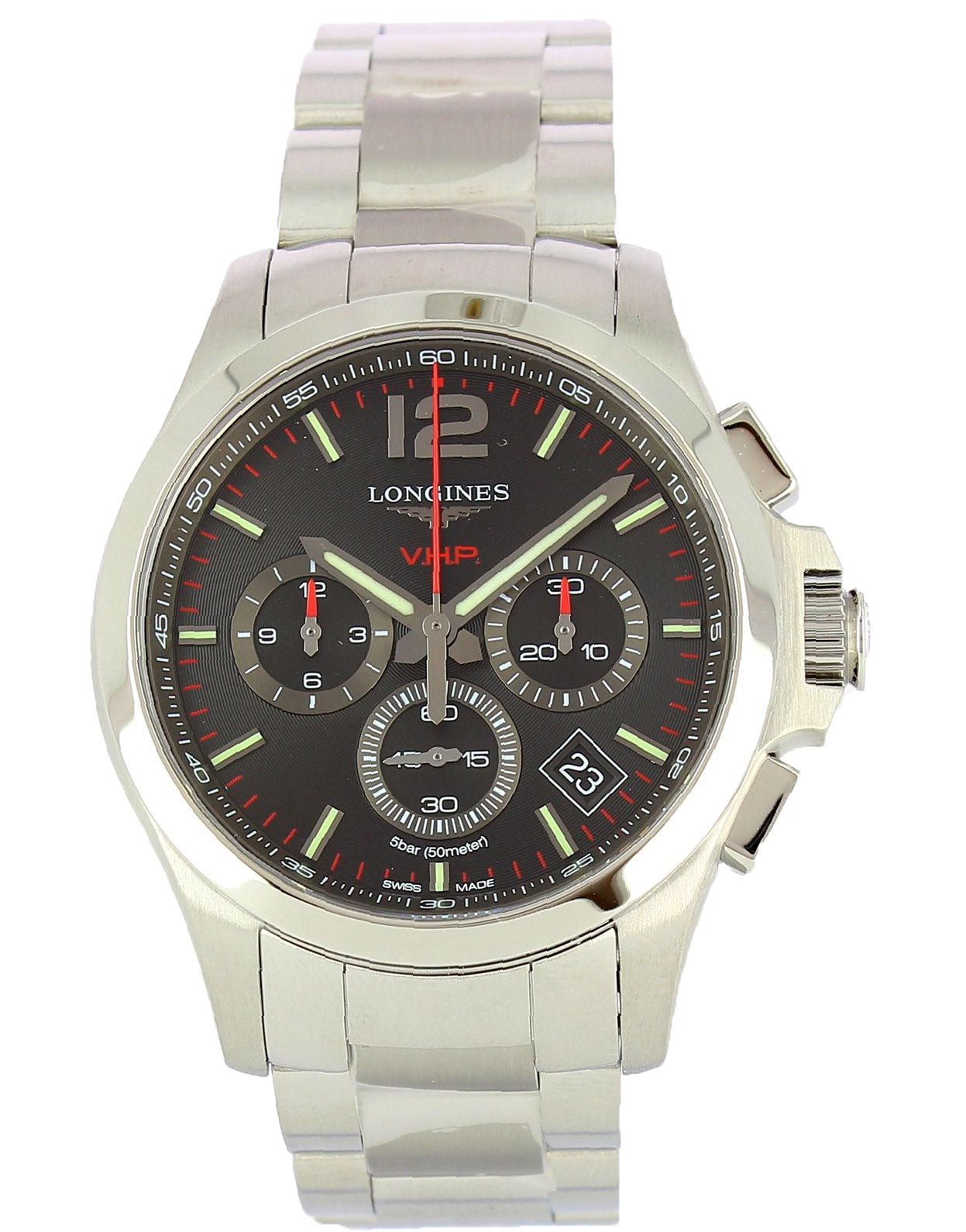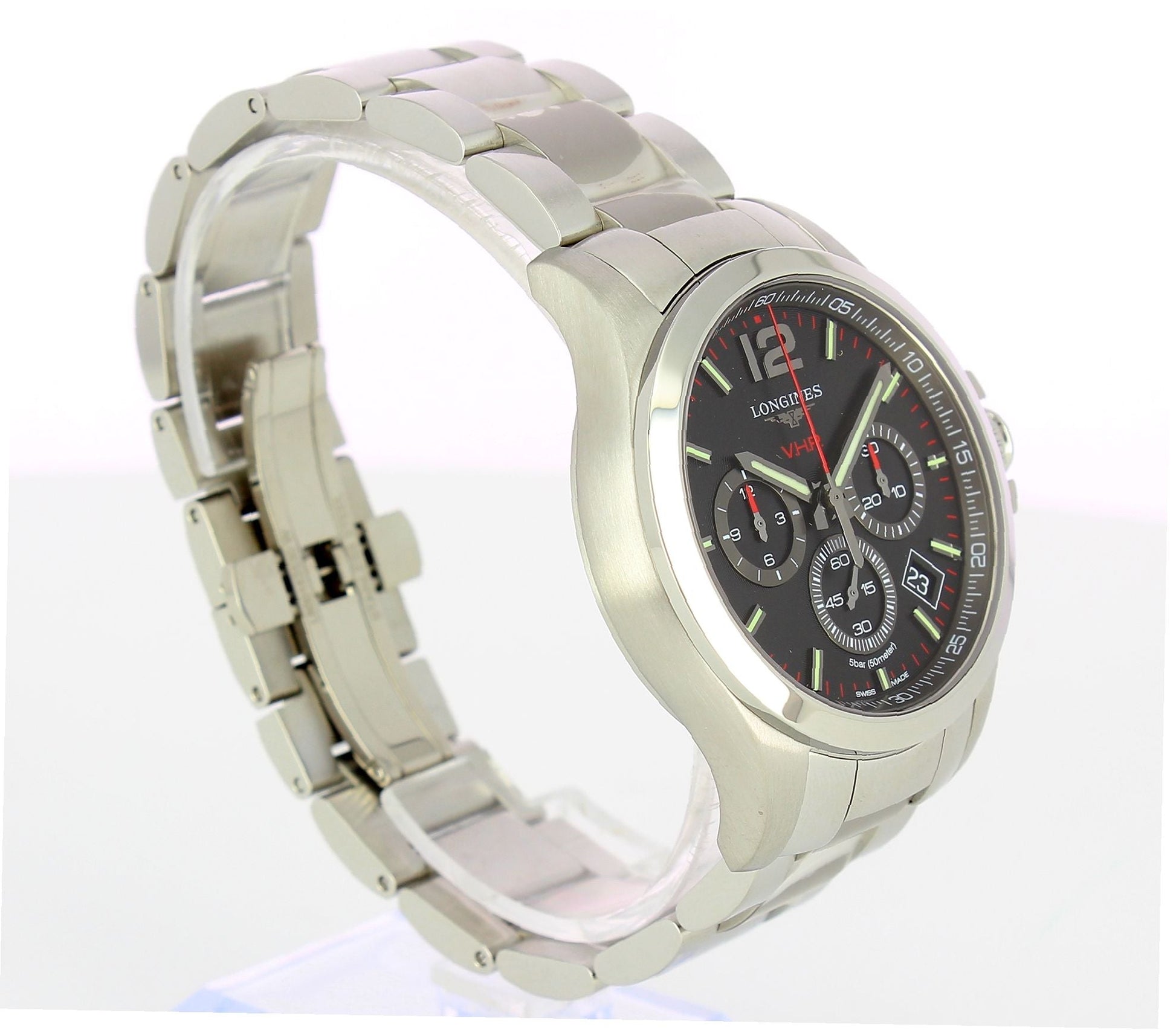 This Conquest VHP has a stainless steel case and bracelet. Fixed bezel . Black dial with index hour markers. Date between the 4 and 5 o'clock position. Chronograph with three sub-dials displaying : 60 seconds, 30 minutes and 12 hours. Longines Calibre L289 Quartz movement. Ref: L37174566