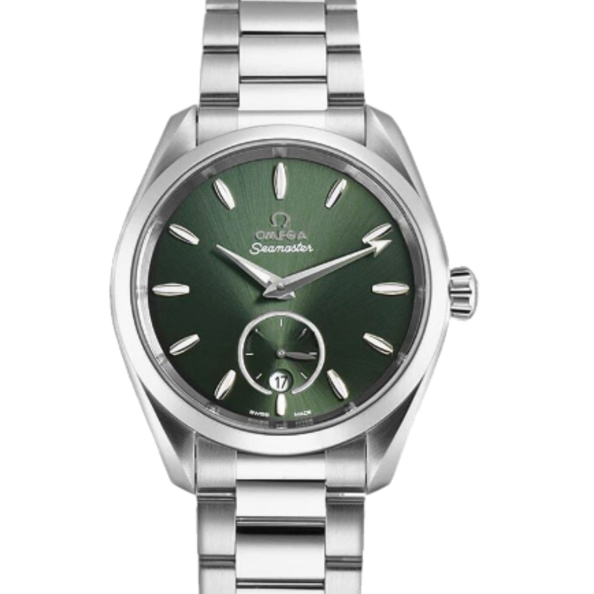 The Omega Seamaster Aqua Terra 150M 38mm (Ref. O22010382010001) features a 38mm stainless steel case, offering a versatile size that suits various wrist sizes. The standout green dial with a horizontal teak pattern adds a vibrant touch, while the polished and brushed case finishes enhance its refined appearance.