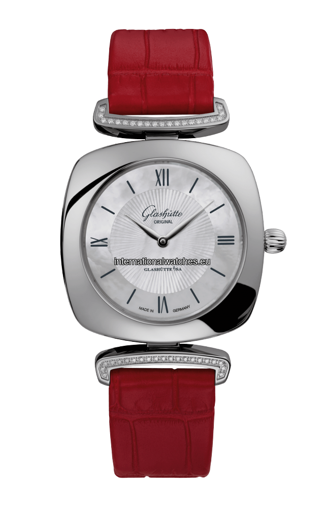 A modern interpretation for sophisticated women: the Pavonina ladies’ watch. Stainless steel, white mother-of-pearl dial, red/orange leather strap.