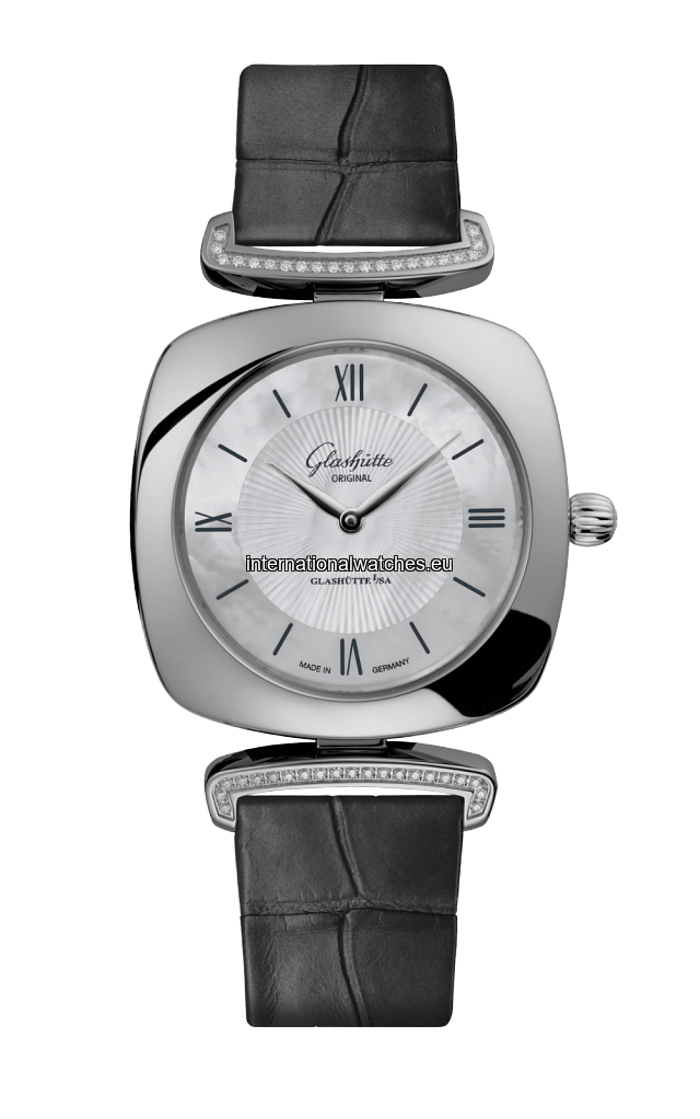 A modern interpretation for sophisticated women: the Pavonina ladies’ watch. Stainless steel, white mother-of-pearl dial, grey leather strap.
