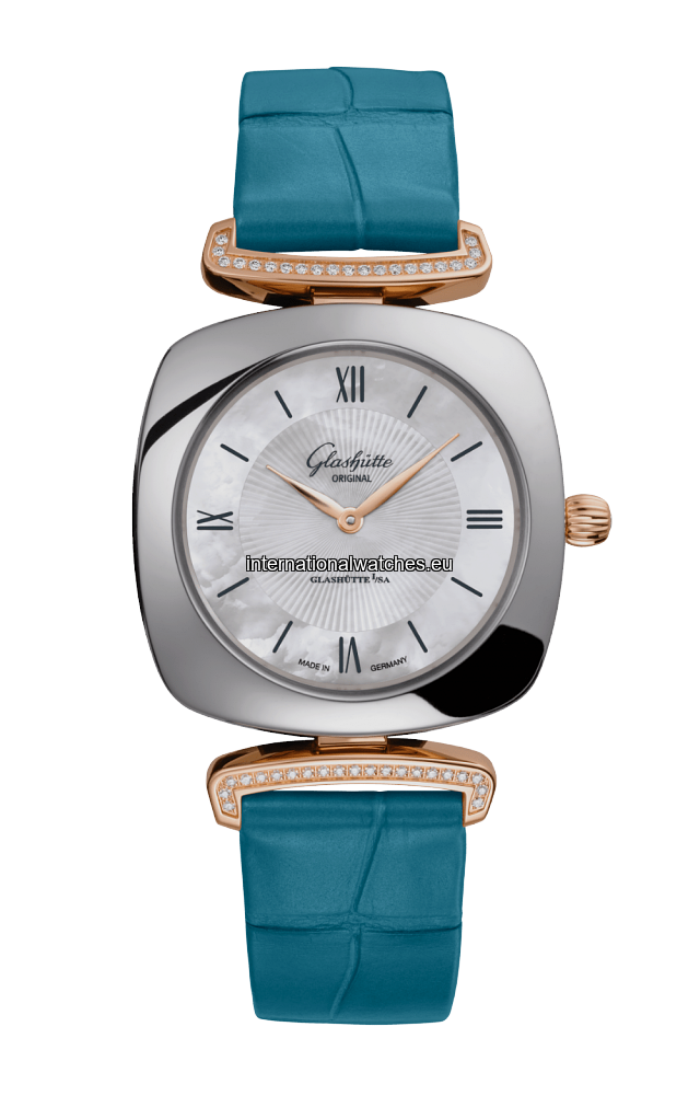 The Pavonina in bi-colour with blue leather strap and white mother-of-pearl dial is a unique ladies’ watch & a hommage to the modern woman.