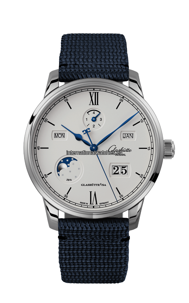 Senator Excellence Perpetual Calendar with a classicaly elegant look. Stainless steel watch, silver dial, Panorama Date, moon phase, blue synthetic strap.