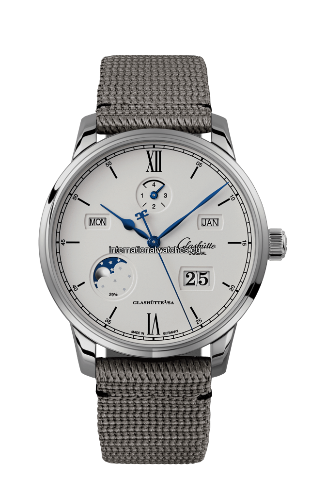 Senator Excellence Perpetual Calendar with a classicaly elegant look. Stainless steel watch, silver dial, Panorama Date, moon phase, grey synthetic strap.