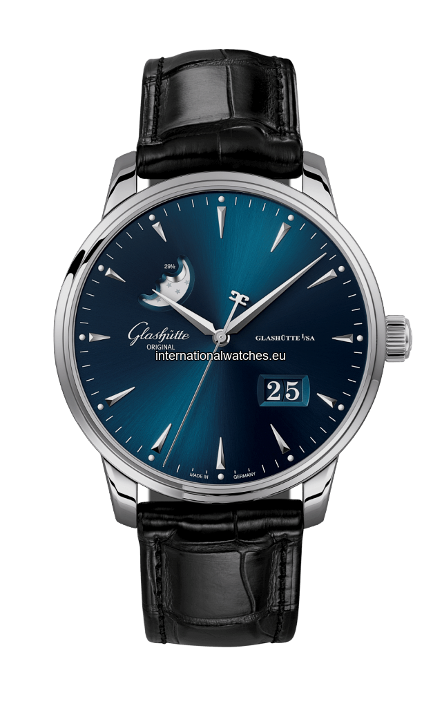 The Senator Excellence Panorama Date Moon Phase is a timeless, elegant men’s watch and elaborately crafted-in-house. Blue dial, black leather strap.