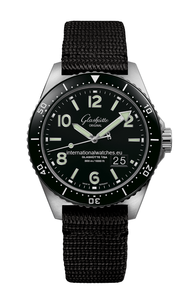 The SeaQ Panorama Date with black dial – a sporty, robust diver’s watch. Easy to read and comfortable to wear. Stainless steel, synthetic strap black.