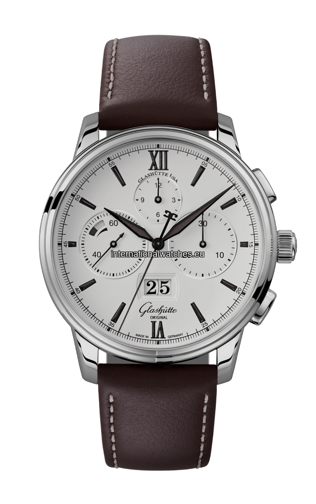 The compelling and sporty-elegant Senator Chronograph Panorama Date. Stainless steel, white dial, 12-hours counter, Super-LumiNova®, leather strap.