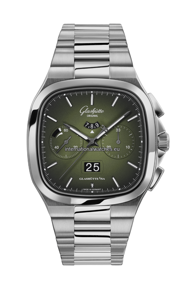 The Seventies Chronograph Panorama Date with green dial brings the 70s to your wrist. Retro-modern in stainless steel. Metal bracelet.