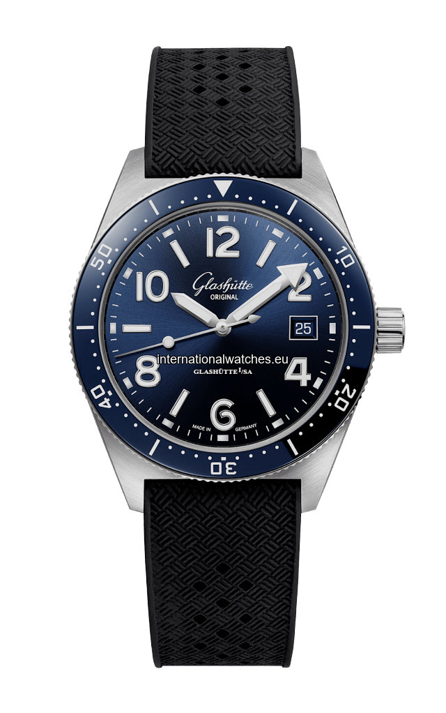SeaQ with blue dial: a diver’s watch with water resistance of up to 20 bar. Very high-contrast for good legibility. Stainless steel, rubber strap.
