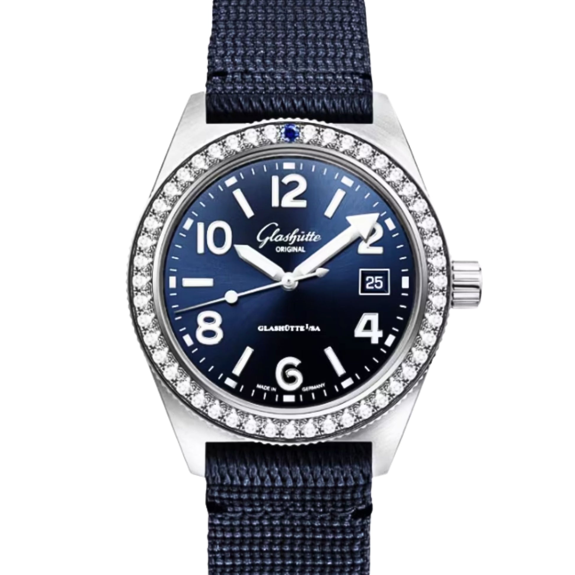 Elegant and sporty at the same time: the SeaQ with diamond bezel. Water-resistant up to 20 bar. Calibre 39-11, stainless steel case, synthetic strap.