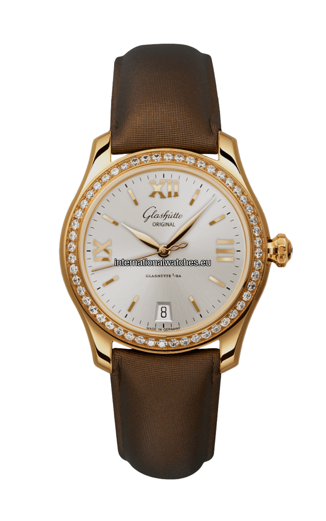 Lady Serenade in rose gold with diamond bezel, silver dial and brown leather strap – an elegant timepiece for women. Made in Germany.