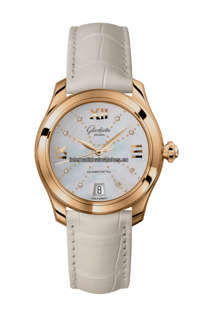Our Lady Serenade combines pure elegance with timelessness – A sophisticated ladies’ watch in rose gold with mother-of-pearl dial & white leather strap.