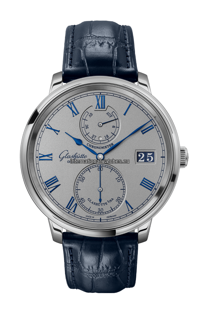 This Senator Chronometer is the royal class of timekeeping. White gold watch, silver-grey dial, second-stop mechanism, Panorama Date, blue leather strap.