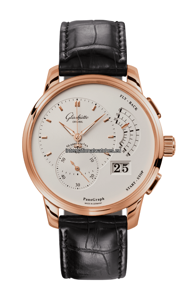 The PanoGraph is an aesthetic pleasure. A red gold watch with Flyback, Panorama Date, stop second chronograph. Silver dial and black leather strap.