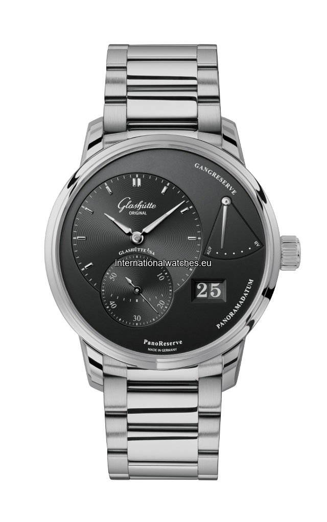 The PanoReserve offers fascinating views and perfection. Stainless steel watch with black dial, Panorama Date, power reserve display, metal bracelet.