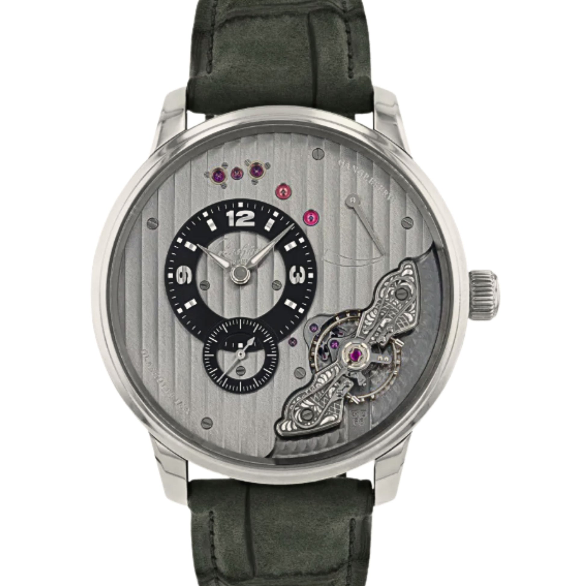 An unusual design with perfect precision: The PanoInverse. Stainless steel, black dial, power reserve display, small second, grey leather strap.