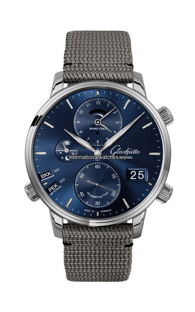 The ideal travel companion: The Senator Cosmopolite with blue dial. Stainless steel watch, second time zone, grey synthetic strap.
