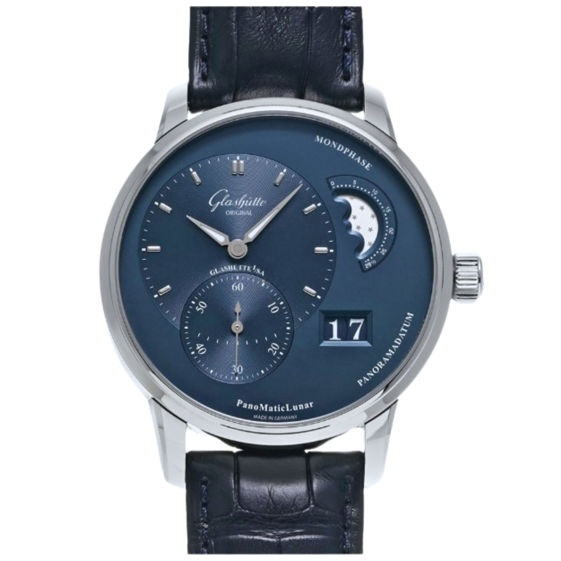 This PanoMaticLunar impresses with its elegant aesthetic perfection. Stainless steel watch with blue dial, blue leather strap, Panorama Date, moon phase.