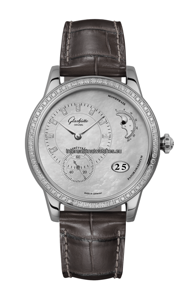 A sparkling, asymmetrical womens’ watch: the PanoMatic Luna with moon phase. Stainless steel, diamond bezel, mother-of-pearl dial, leather strap taupe.
