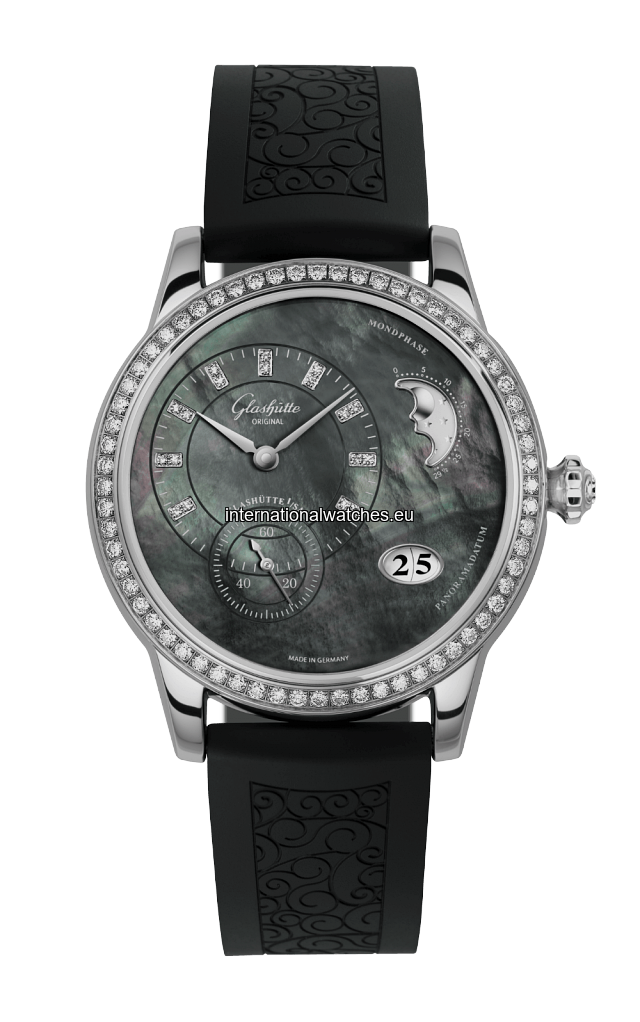 Asymmetrical, sparkling, sophisticated: the PanoMatic Luna in black. Stainless steel, moon phase, Panorama Date, black mother-of-peal dial, rubber strap.
