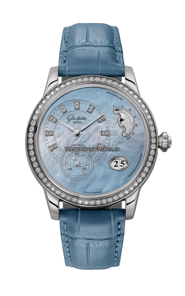 The PanoMatic Luna in blue with moon phase: an asymmetrical, sparkling & sophisticated ladies’ watch. Stainless steel, diamond bezel, mother-of-pearl dial.
