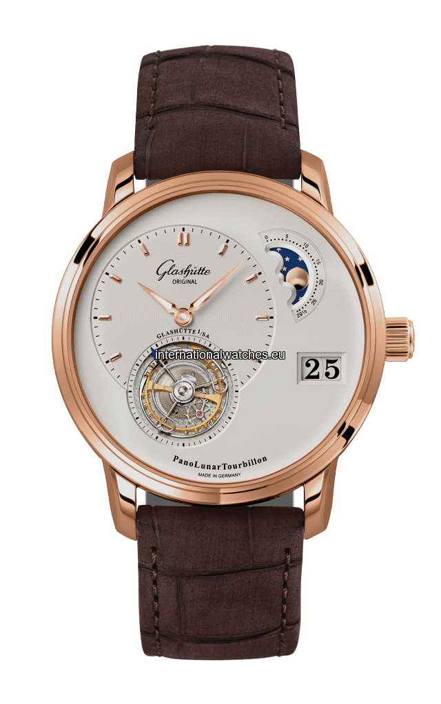 The PanoLunarTourbillon with an exquisite Flying Tourbillon. Red gold watch with silver dial, Panorama Date, moon phase, brown leather strap.