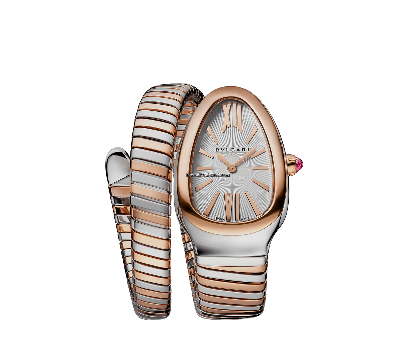 Serpenti Tubogas single-spiral watch in 18 kt rose gold and stainless steel with white opaline dial with guilloché soleil treatmen. Water-resistant up to 30 metres