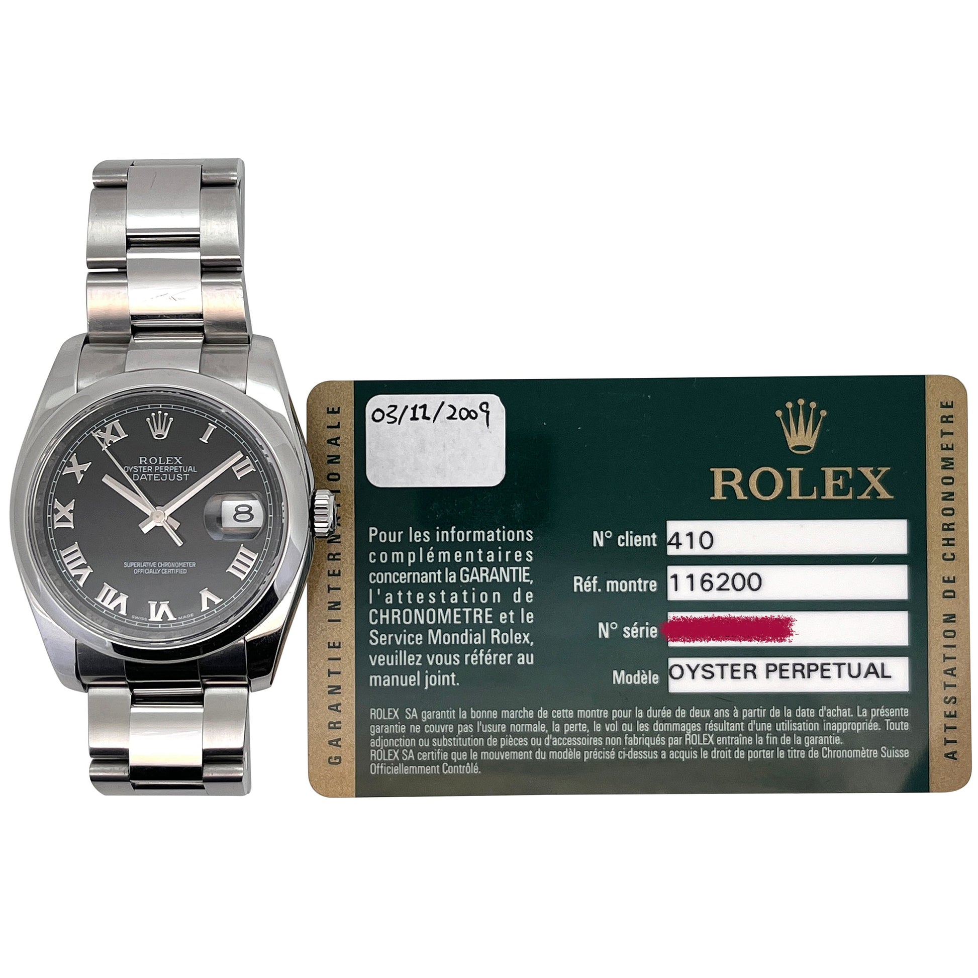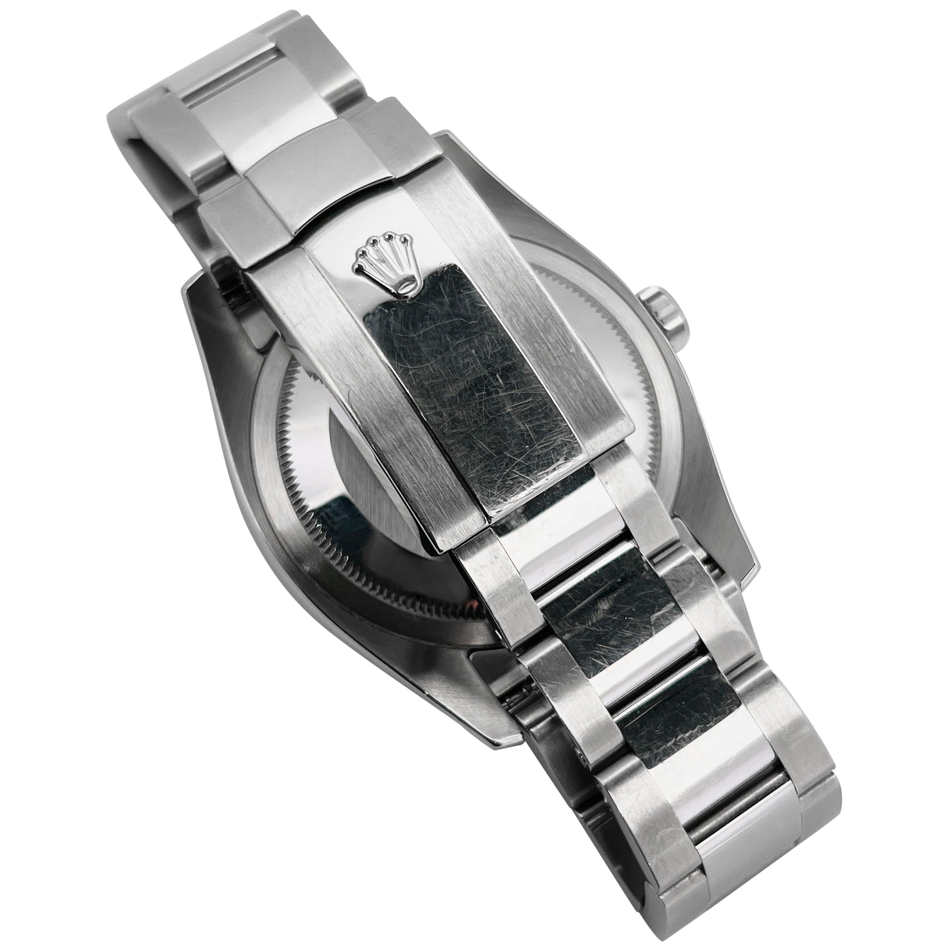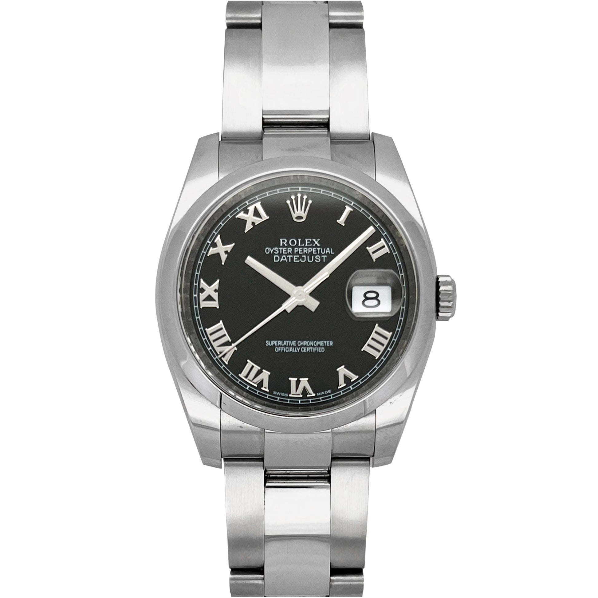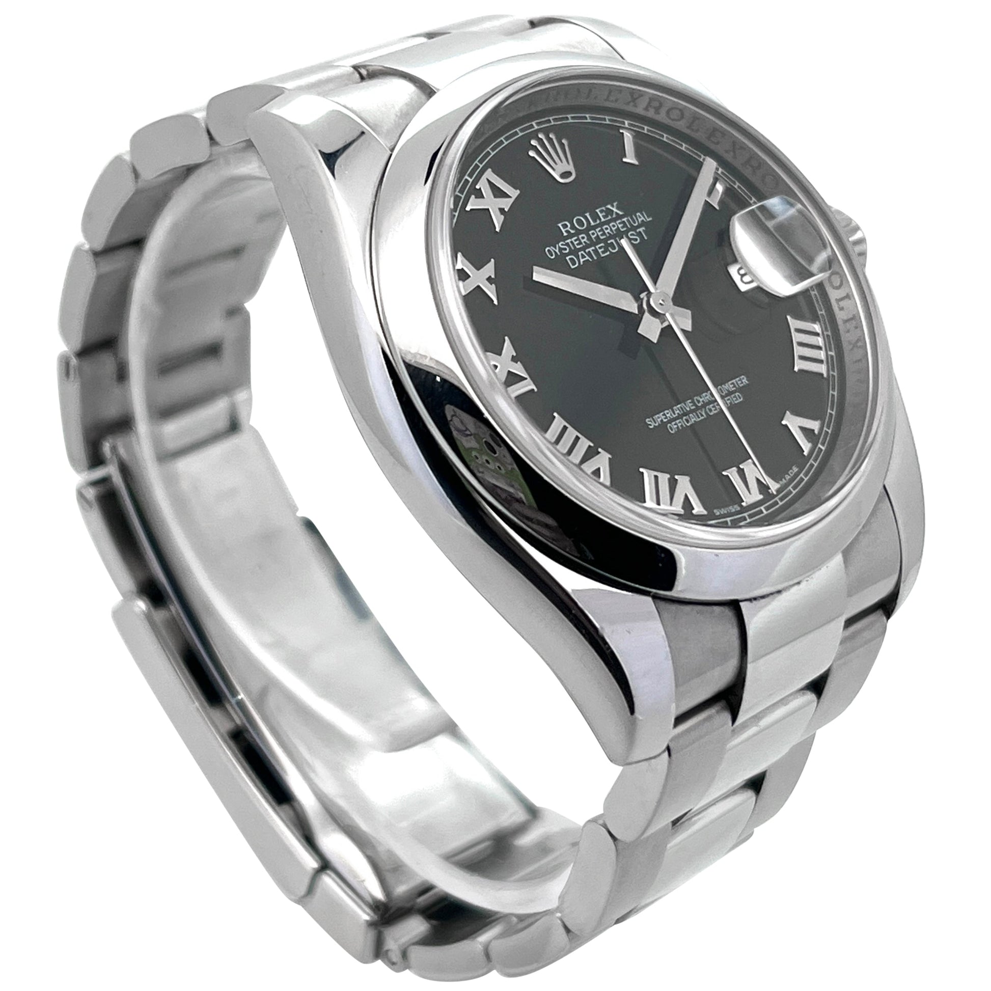 Stainless steel case with a stainless steel bracelet. Fixed domed stainless steel bezel. Date displays at the 3 o'clock position. 31 jewels automatic movement. Scratch resistant sapphire crystal. Solid case back. Case diameter: 36 mm. Deployment clasp. Water resistant at 100 meters/ 330 feet.