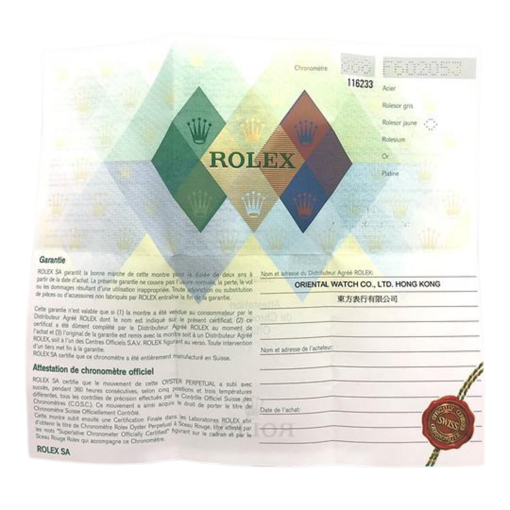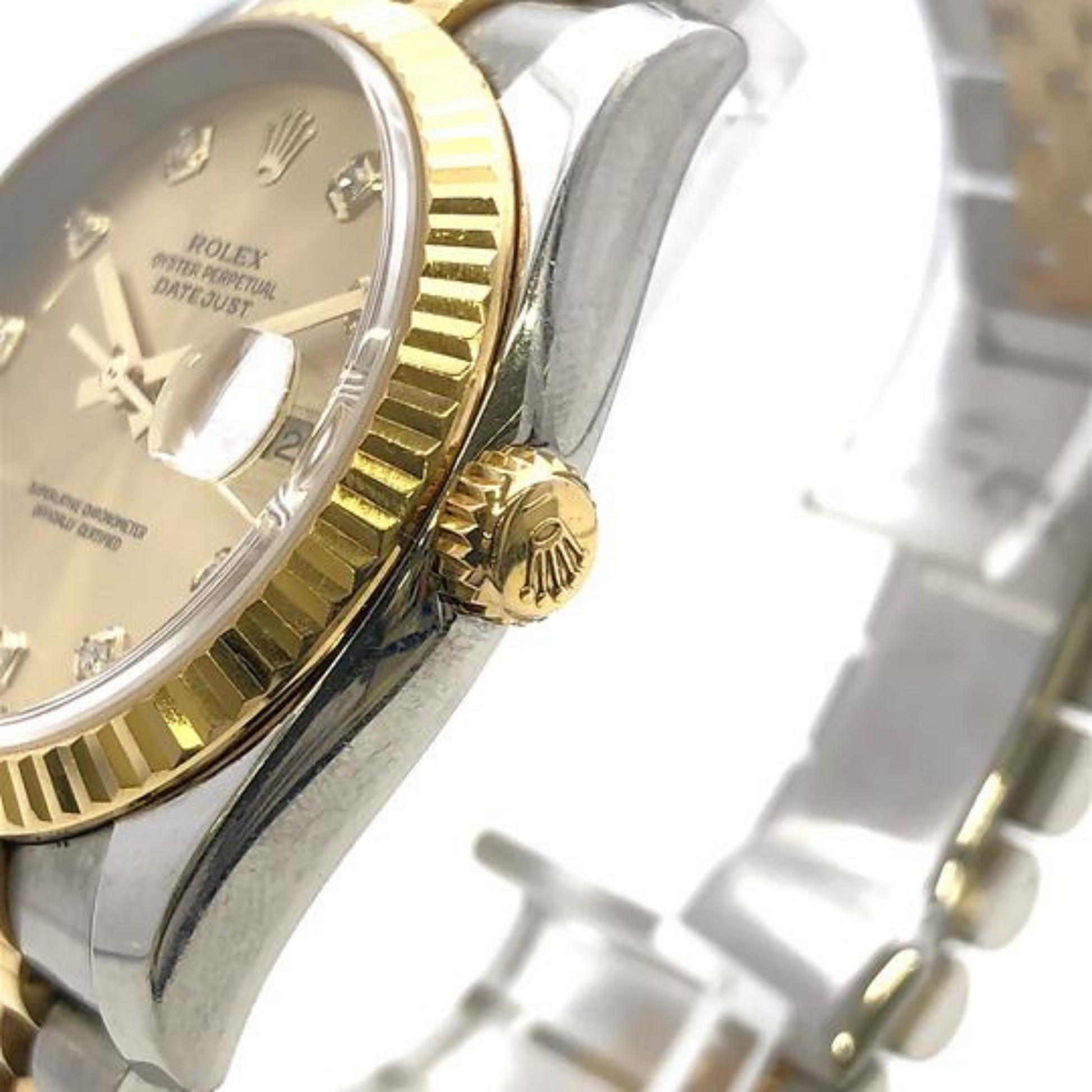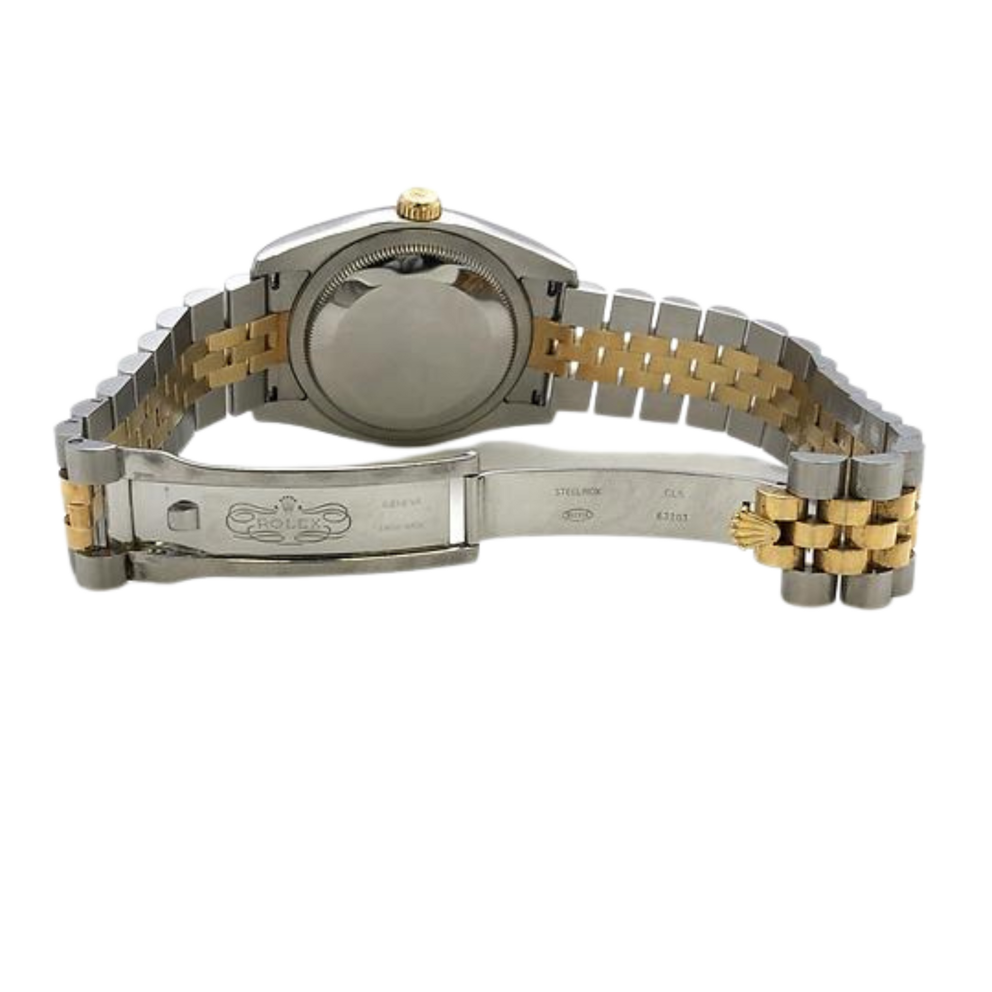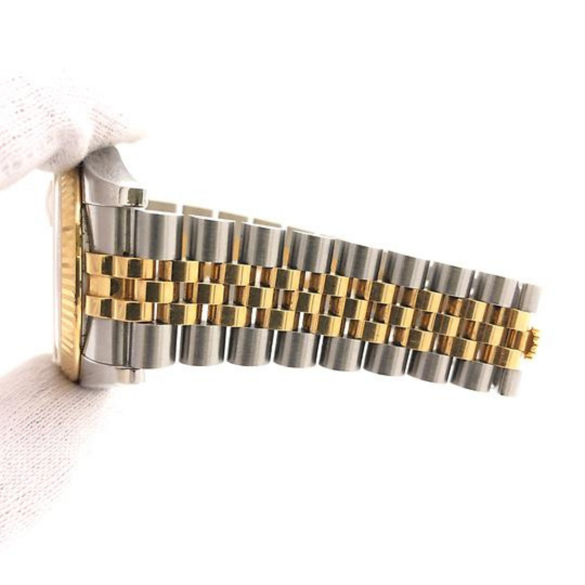 Polished stainless steel case. Polished 18kt yellow gold crown. Polished 18kt yellow gold fluted (wave design) bezel. Bracelet with brushed finished outer links & polished finished center links. Date window displayed at the 3 o\'clock position with a cyclops magnifying lens. All date numbers in black. Rolex Caliber 3135, beats at 28,800 vph, contains 31 Jewels & has an approximate power reserve of 50 hours.