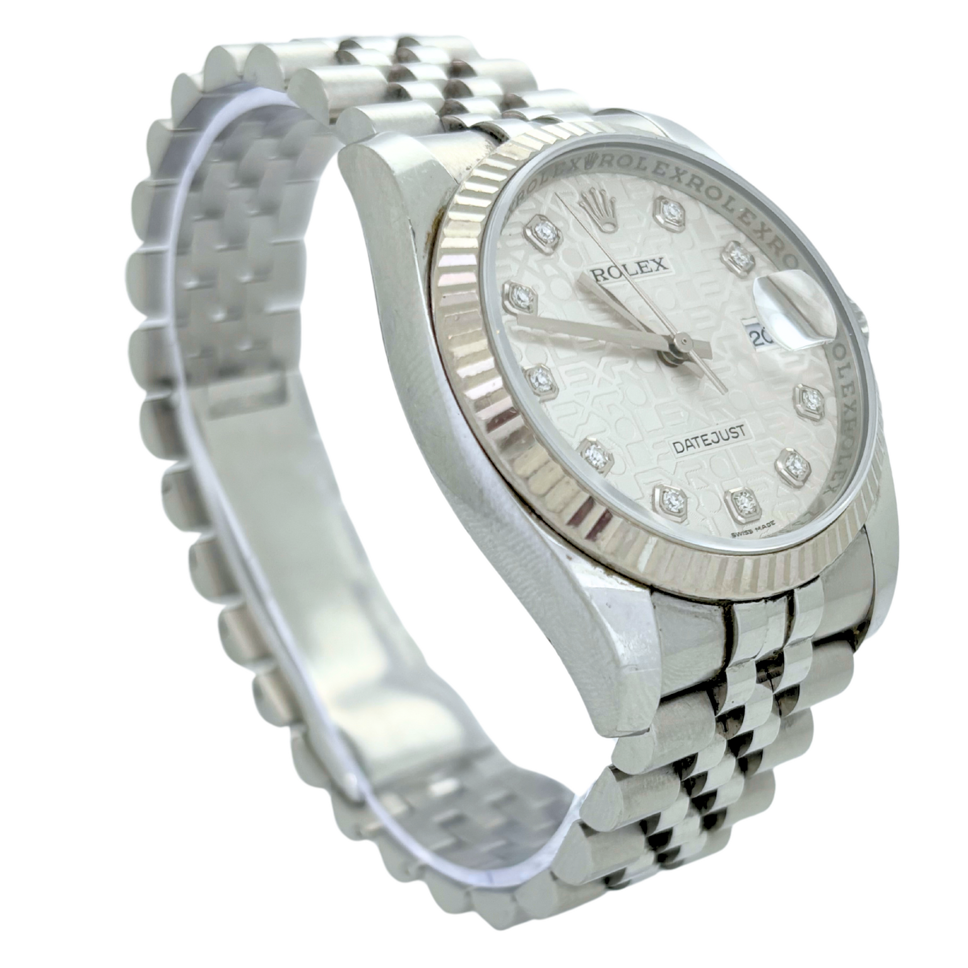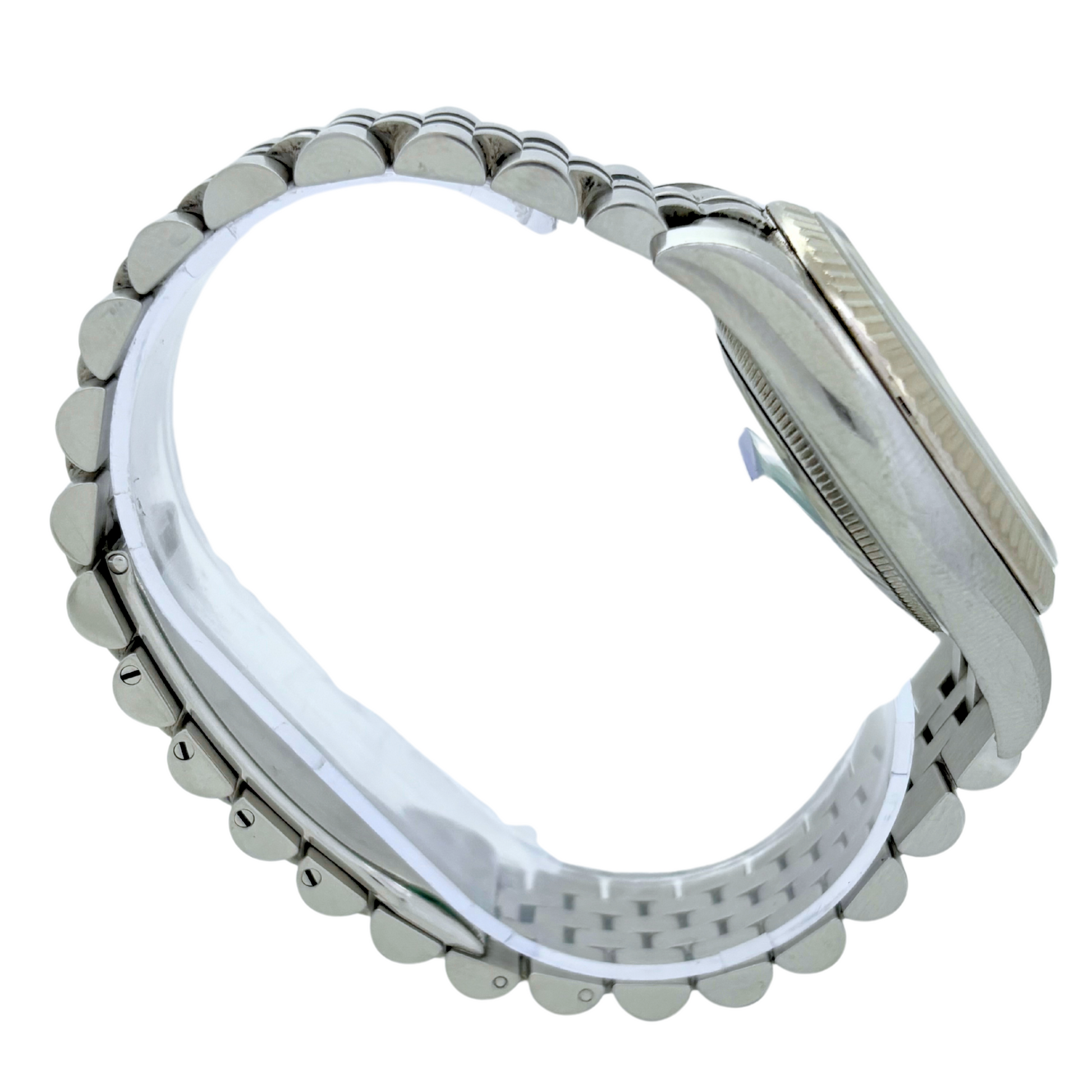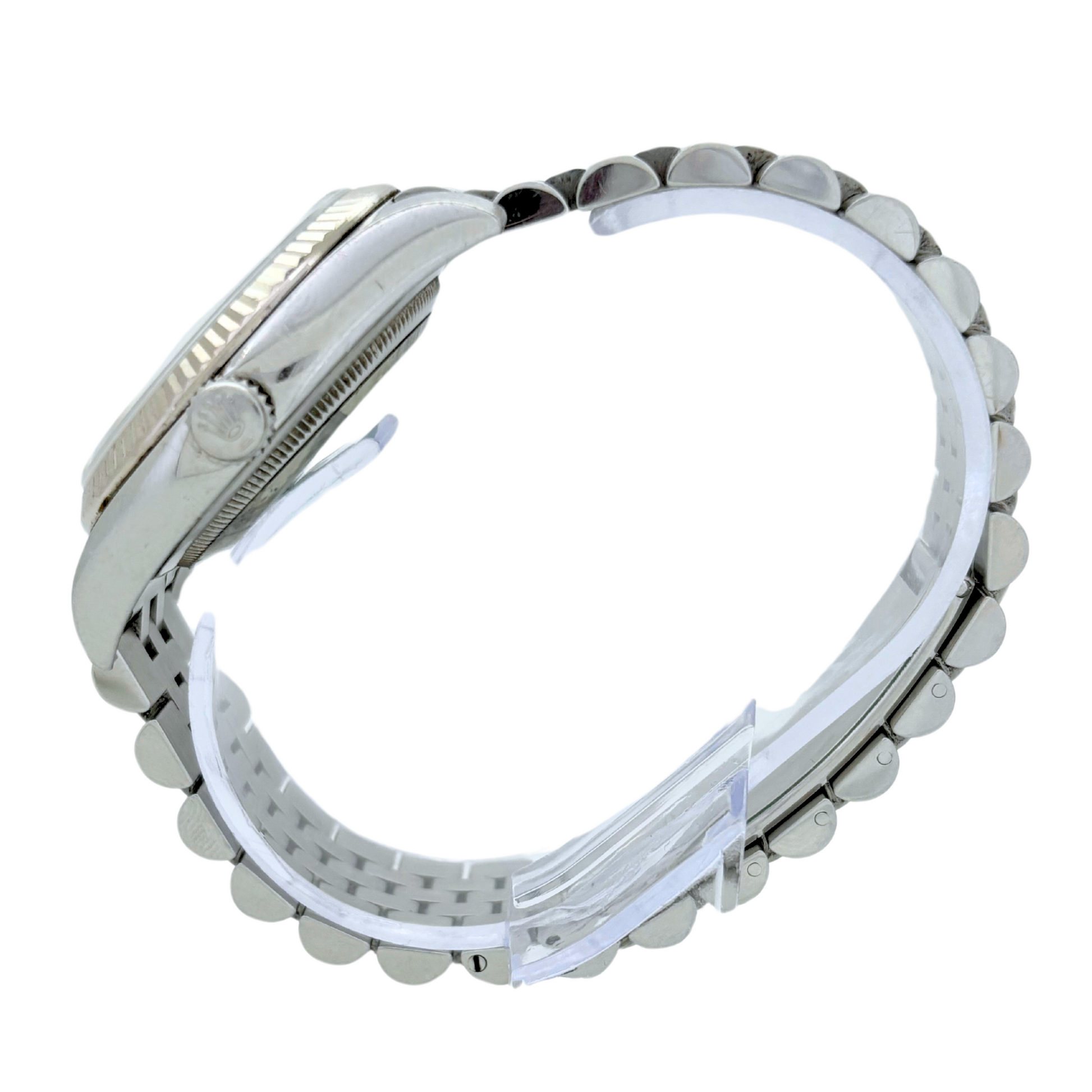 The midsize Rolex Datejust 36 116234 collection of watches for men and women feature a solid 18k white gold fluted bezel set on an oystersteel stainless steel case with the option of the Rolex oyster bracelet or jubilee bracelet. The case houses the COSC Superlative Chronometer Certified Rolex Caliber 3135 self-winding automatic movement. Like all other Rolex Datejust watches, this collection features the instantaneous date setting feature and stop-seconds feature for precise time setting.